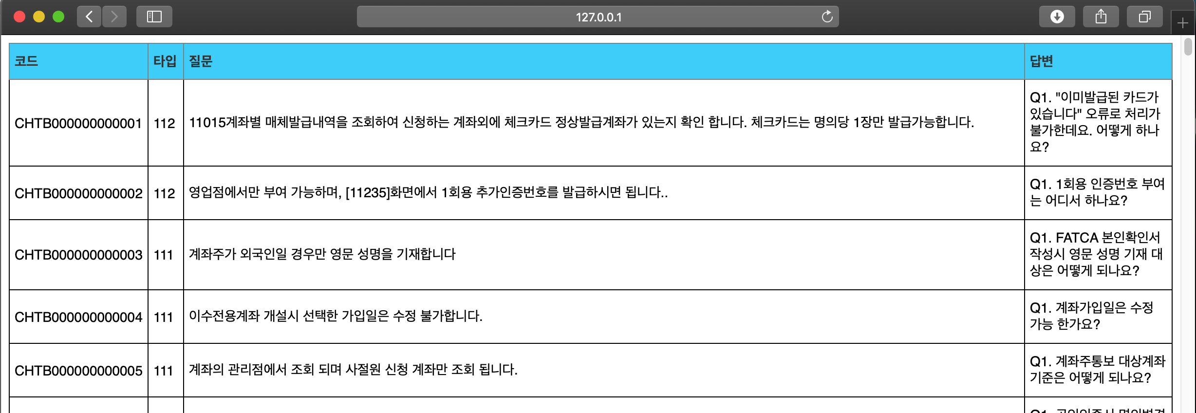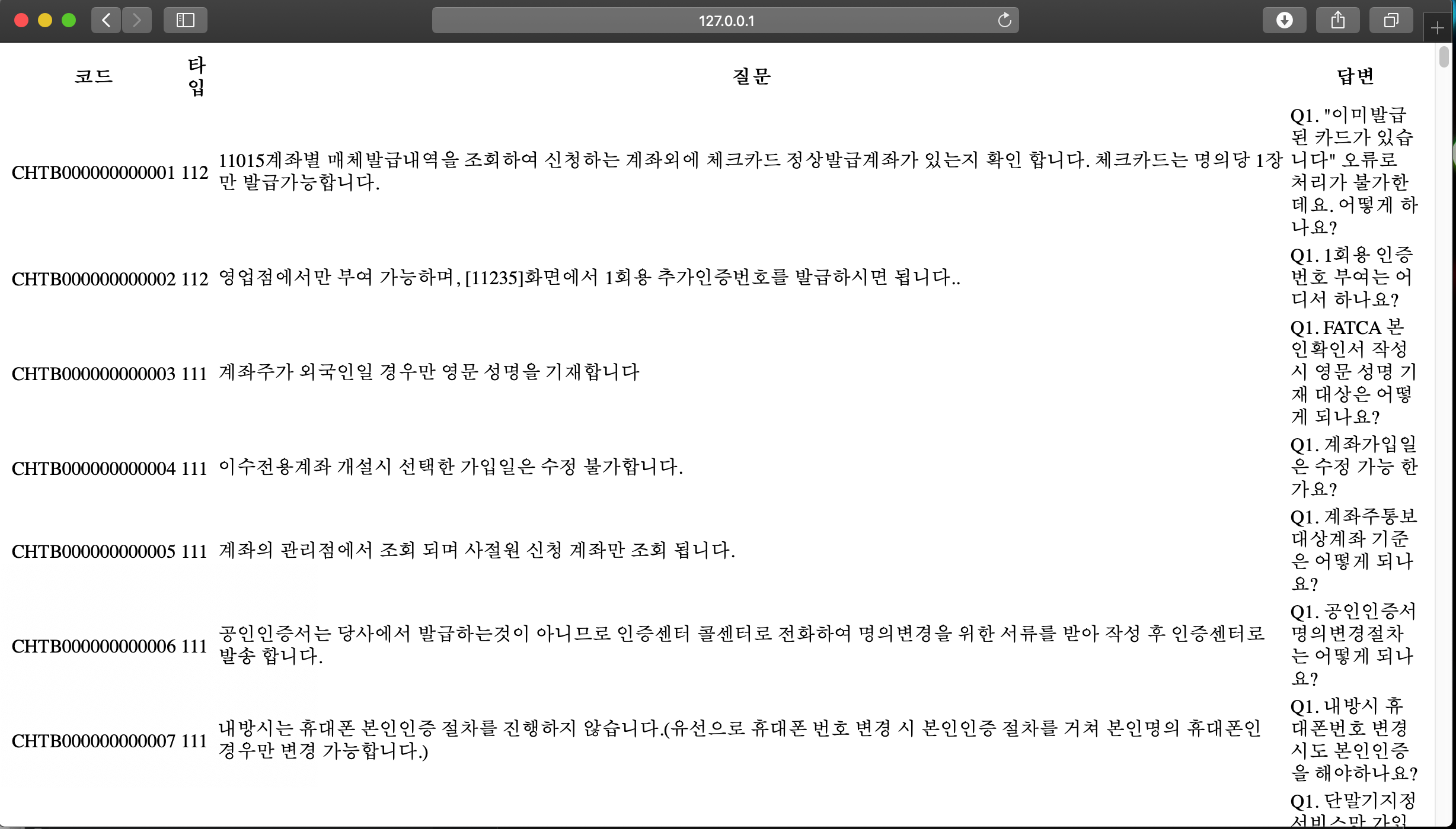 - 질의응답 데이터는 DB에 저장되고, 화면에 게시판 형태로 뿌려주고, 수정, 삭제, 추가가 가능해야 됨