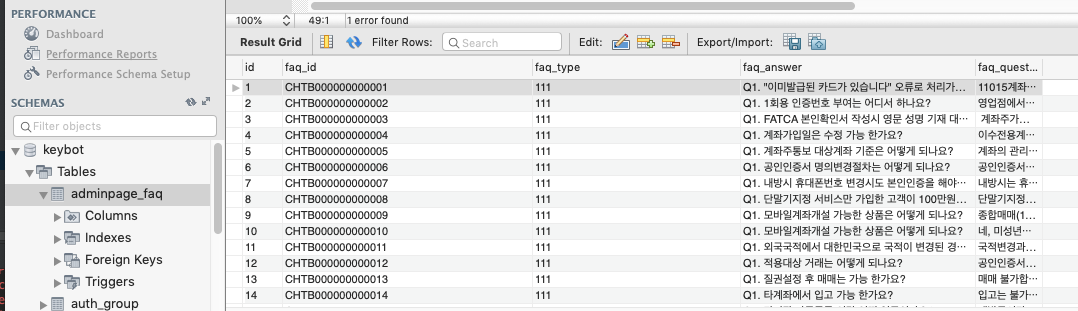 MVC에서 Model역할과 동일한 역할을 하는 것이 장고의 models.py입니다. 저는 Faq라는 모델을 만들고 안에 4개의 필드를 선언했습니다. 이 모델을 아까 views.py에서 참조에서 Faq.objects.all() 메서드를 사용해 서버에 저장되어있는 모든 Faq객체를 adminpage/index.html로 보냅니다. 왜냐하면 adminpage/index.html에서 모든 객체를 보여주기 위해서지요.
