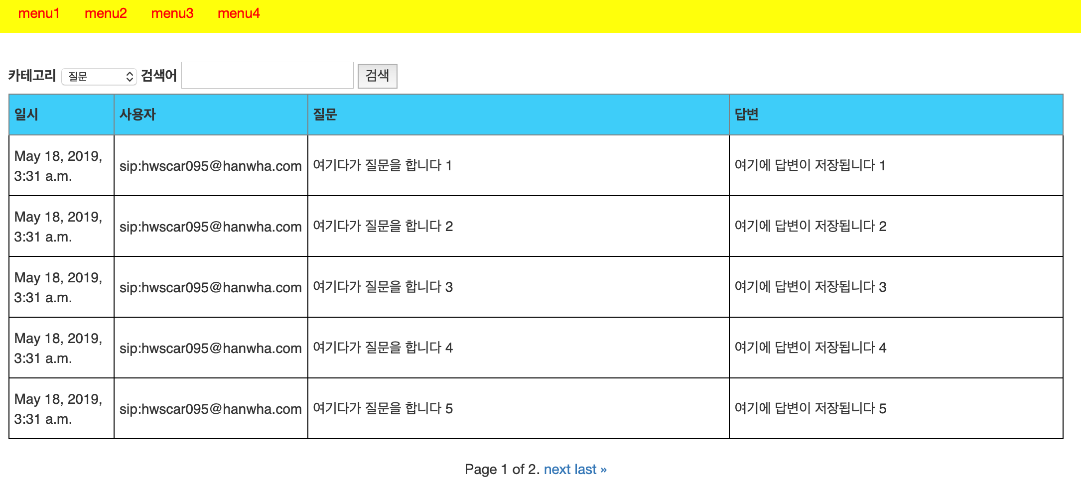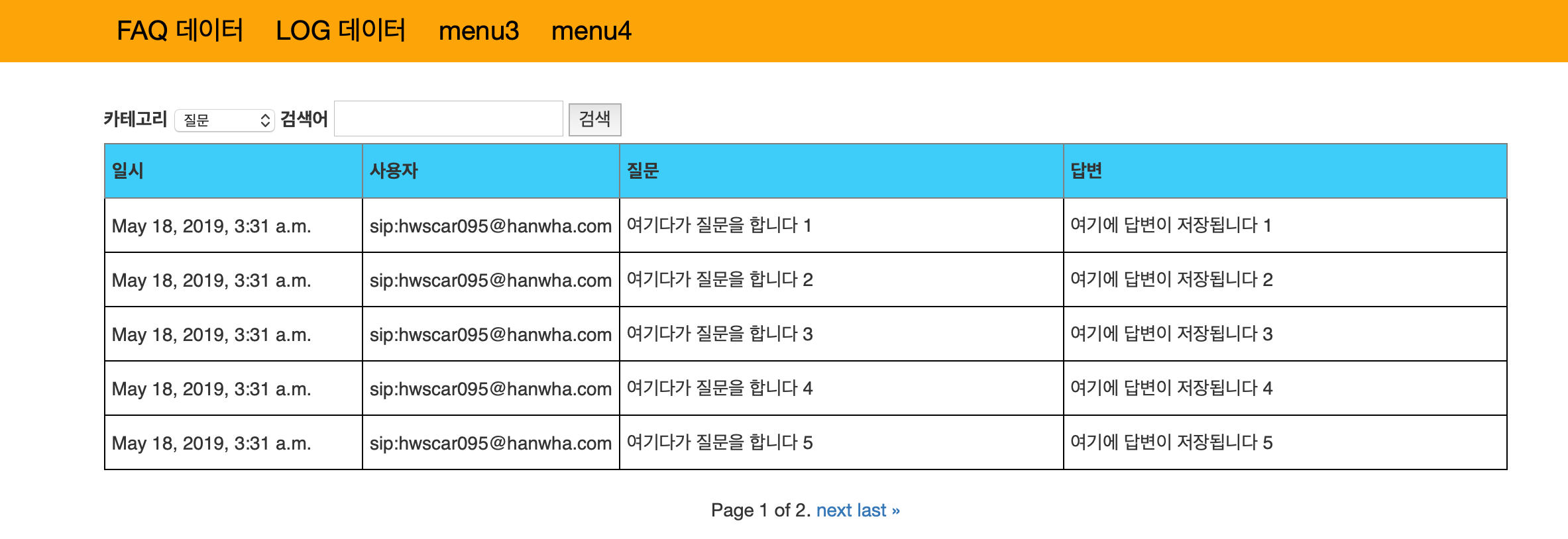 일단은 현재 사용 중인 list_faqs.html 화면 상단에 메뉴바를 추가해봤다. CSS를 간단하게 만들고 href를 이용해 간단하게 메뉴 1~4까지 텍스트로 만들어 보았다. 뭐 아직 4개나 필요한지 모르겠지만 일단 만들었다. 아마 1번째는 리스트 보는 거고 2번째가 로그 보는 거겠지?