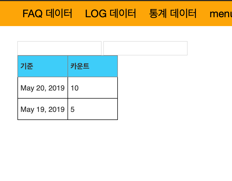 첫 번째로 만들었던 질문 답변 리스트 데이터는 날짜 필드가 없어서 상관없는데, 로그 리스트 보는 페이지와 통계에는 범위를 넣을 수 있는 위젯이 필요할 것 같습니다. 특정 범위로 검색하는 일이 많을 것 같아서요. (+ 추가로 통계에는 일/월 선택창도 필요할 듯)