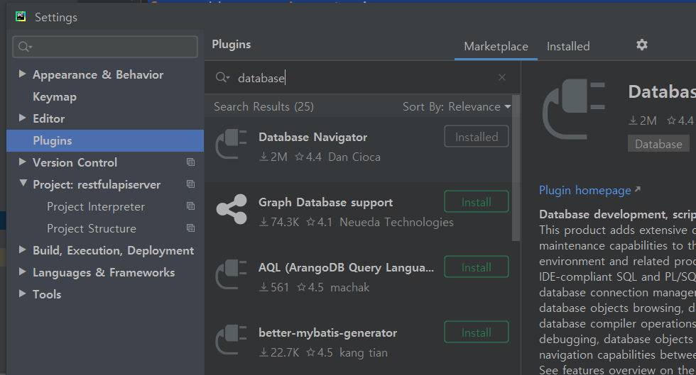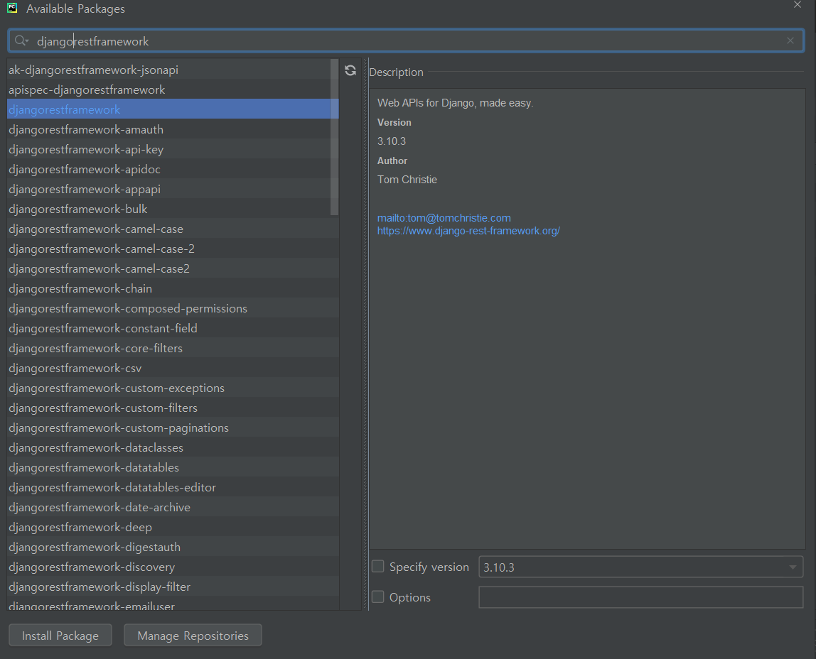 장고 프레임워크 중에 djangorestframework라는 훌륭한 프레임워크가 있습니다. 간단한 설정만으로 장고를 restful api 서버로 만들어주죠. 일반적인 패키지 설치와 똑같이 pip install djangorestframework로 쉽게 설치 가능합니다. 하지만 저희는 PyCharm을 쓰기 때문에 설정 메뉴에서 간단하게 설치 가능하죠!