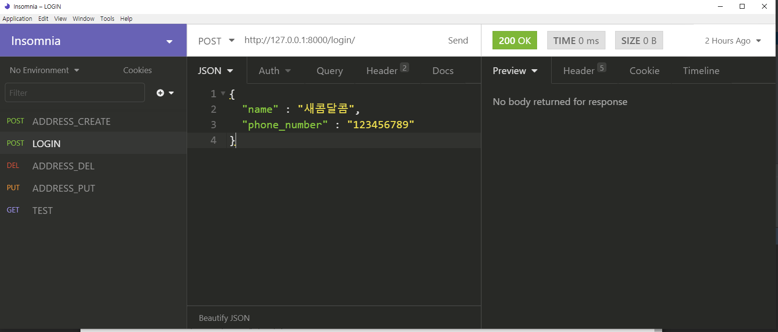 마지막으로 LOGIN은 아래와 같이 일부러 틀린 phone_number를 넣어보고 맞는 phone_number도 넣어봅시다. 200이 오면 성공이고 400이 오면 에러입니다.