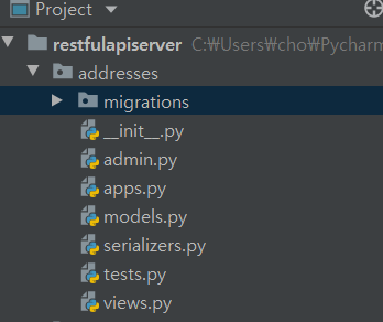 startapp을 하면 프로젝트 폴더 안에 addresses라는 폴더가 생긴 것을 확인할 수 있습니다. 디폴트로. py파일 몇 개도 같이 생깁니다.