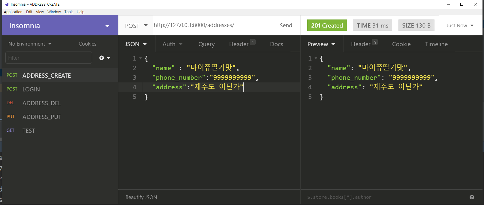 POST로 데이터를 좀 만들어보고 조회를 해봅시다. POST로 데이터 생성하는 건 URL을 ~/addresses/로 하고 POST로 날리면 됩니다.