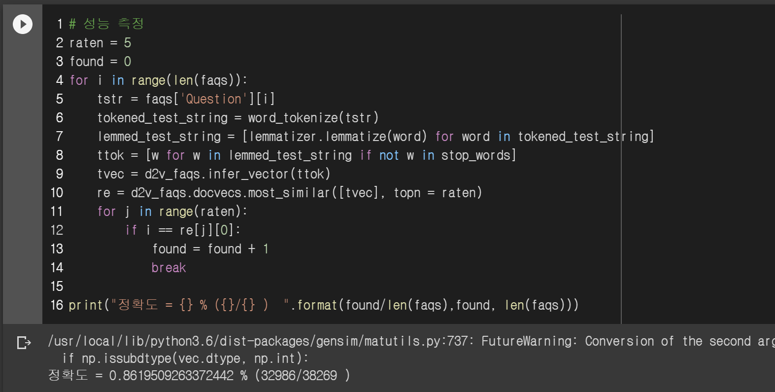 물론 100%가 나오면 좋겠지만.. 그런 이상적인 모델은 이상에 존재하겠죠? ㅎㅎ... FAQ 챗봇이니 비슷한 질문을 찾아주는데 86%면 나름 높은 성능을 보여줄 것 같습니다.