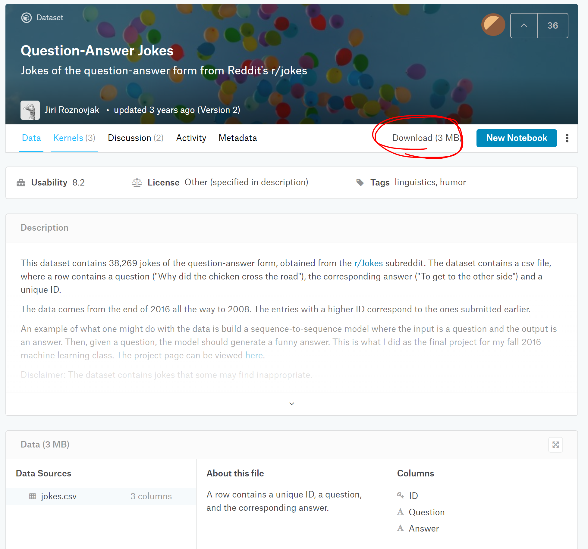 일단 캐글에서 FAQ데이터를 가져와볼게요 url은 요기~ https://www.kaggle.com/jiriroz/qa-jokes