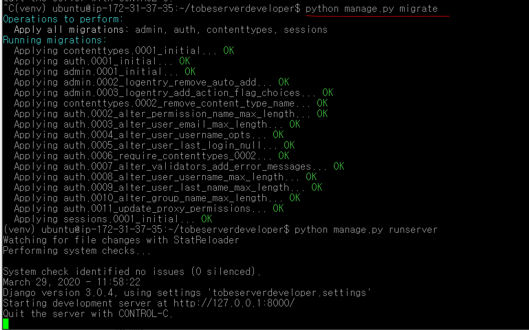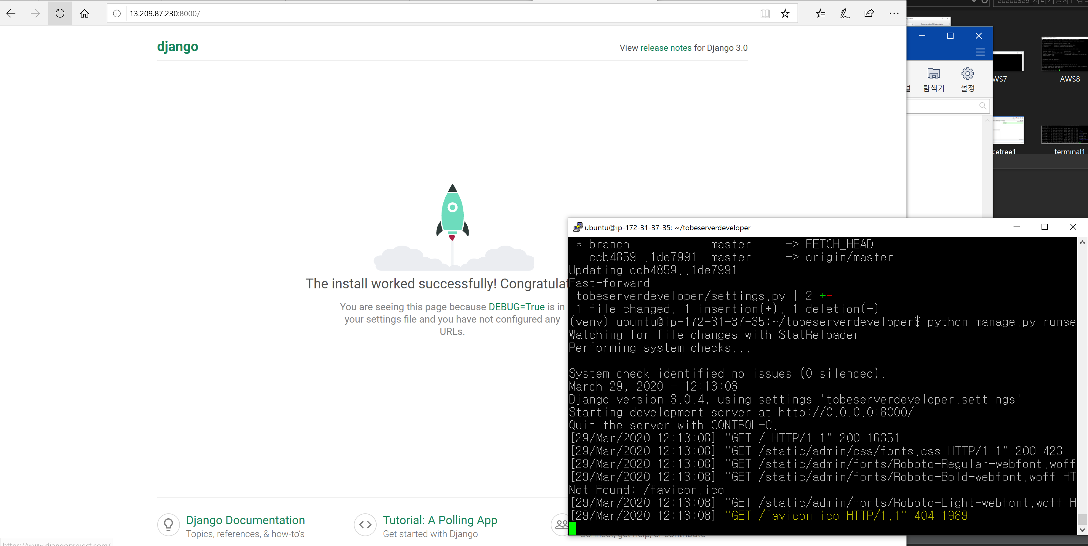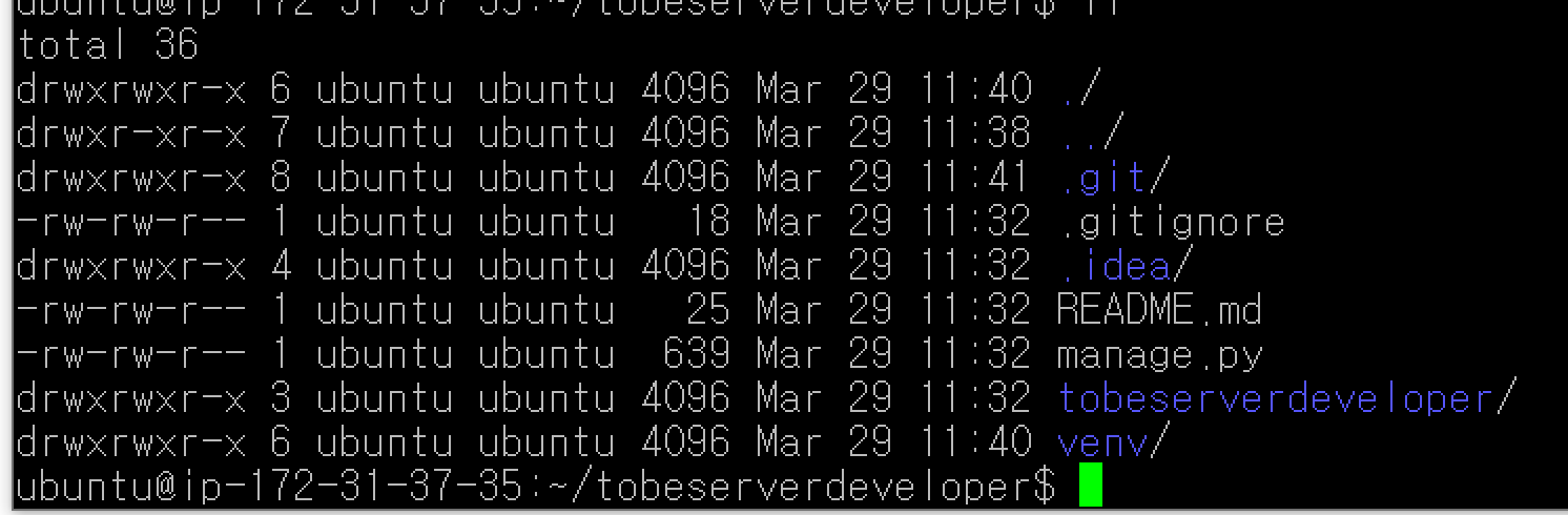 드디어 서버에서 Django 프로젝트가 돌아갑니다. 앞으로 로컬에서 개발하고 git에 push 하면, 서버에서 git pull을 통해 변경된 소스를 반영할 수 있게 되었습니다.