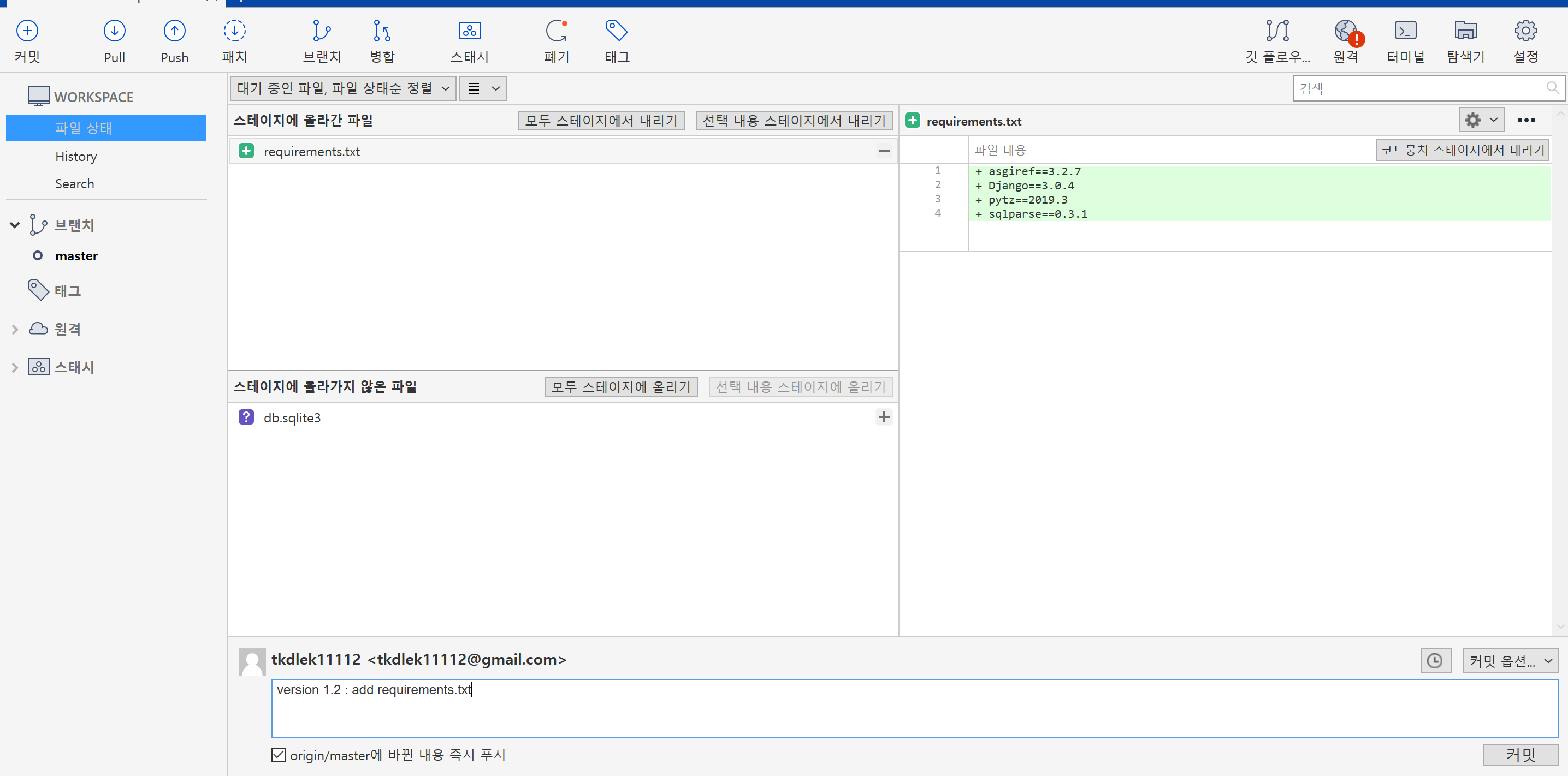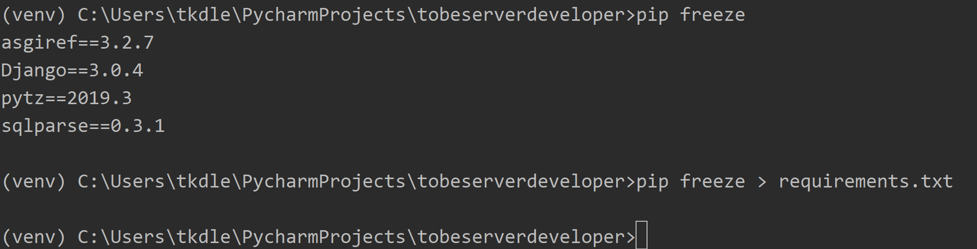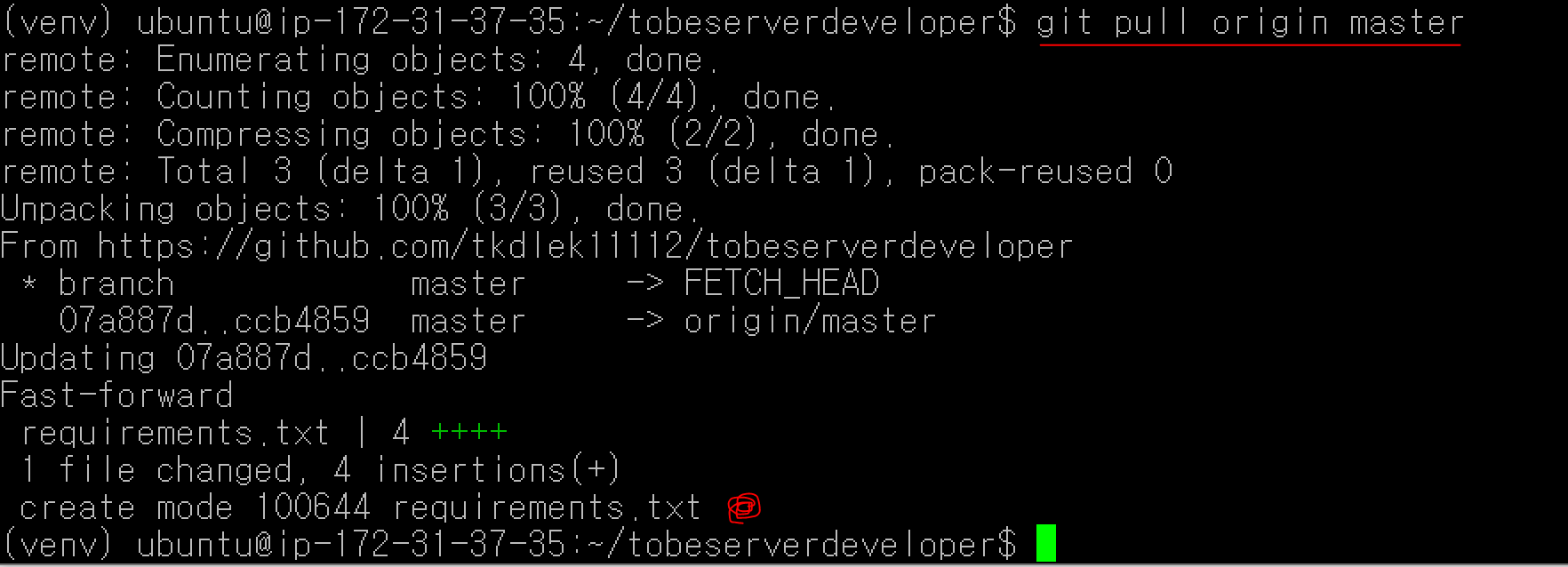 명령어를 실행하면 루트 폴더에 requirements.txt 파일이 생긴 것을 알 수 있습니다. 이걸 git에 등록해서 푸시하고, 서버에서 pull로 받아봅시다.