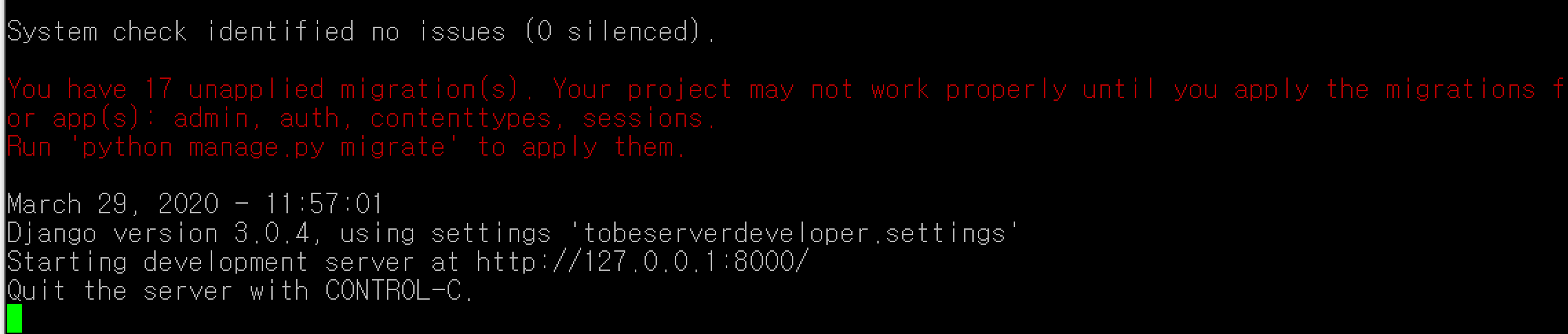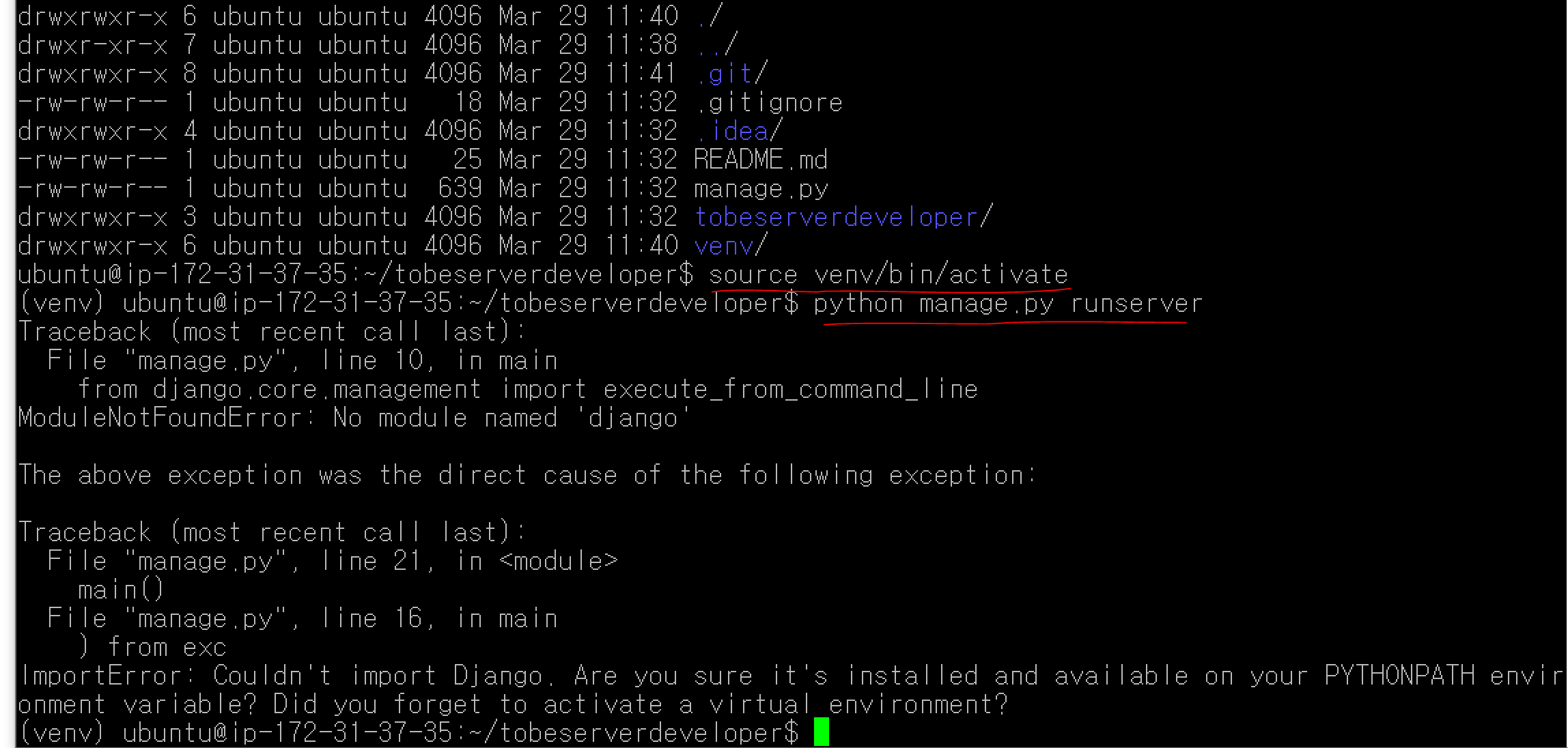 이렇게 requirements.txt 파일을 활용하면 로컬에서 설치한 패키지들을 서버에서도 똑같이 설치할 수 있습니다. 로컬과 서버의 패키지를 동기화시켜주는데 아주 도움을 많이 주고 있는 녀석입니다. 서버가 여러 대라면 더욱 그렇구요. 이제 다시 서버를 가동해봅니다. runserver~!! 는 또 뭐라고 빨갛게 나오네요...
