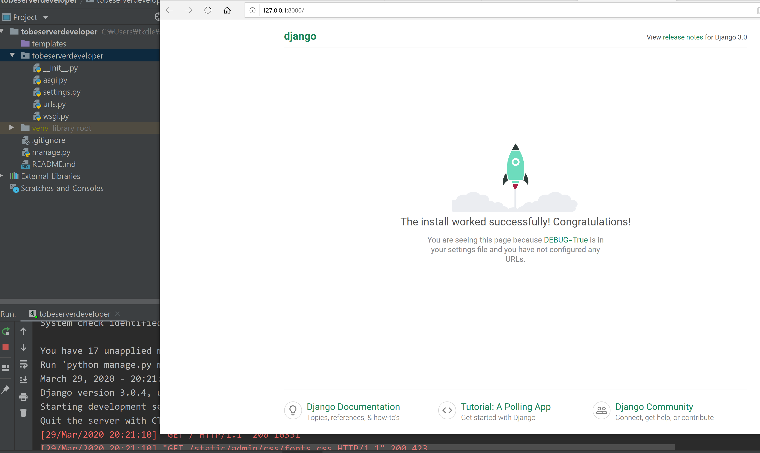 기본 프로젝트를 github에 올렸습니다. venv는 빼고 올렸기 때문에 나중에 서버에서 가상 환경을 만들어주고 띄워야 합니다. 일단 로컬에서 이 Django 프로젝트가 정상 동작하는지 테스트해보겠습니다. pycharm에서 run을 실행합니다.