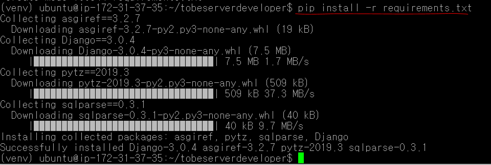 이제 requirements.txt에 명시된 패키지를 설치해보겠습니다. 간단하게 명령어 한 줄이면 됩니다.