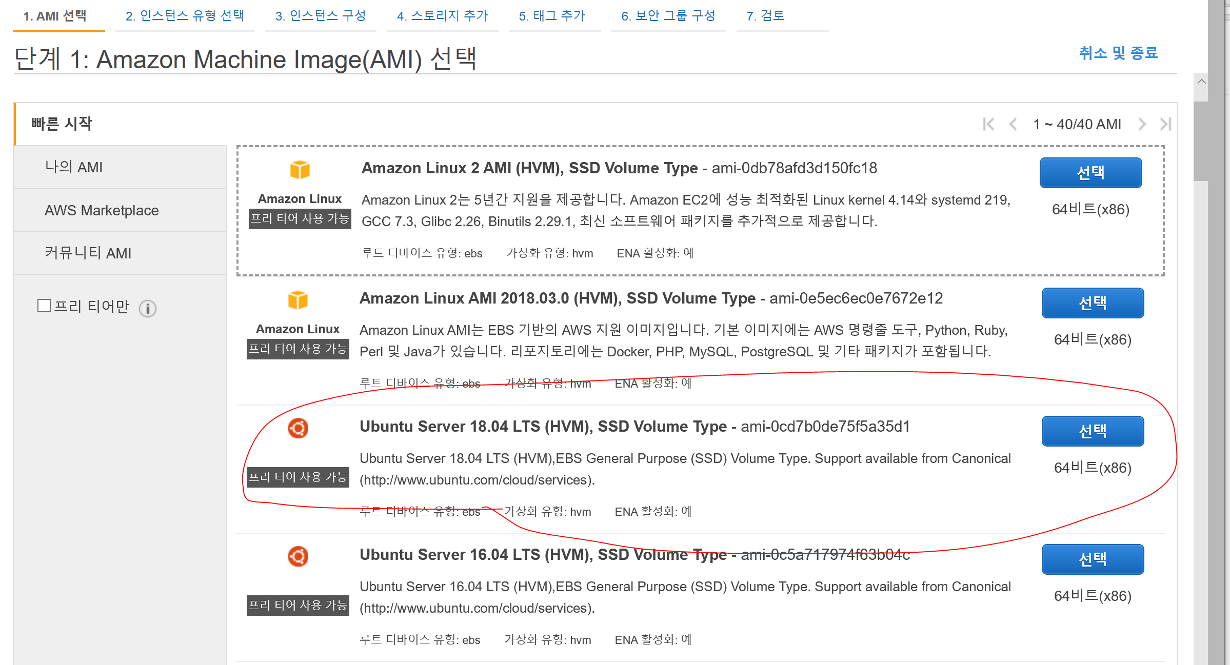 예~~~ 전에는 EC2 인스턴스를 누르고 그다음 OS를 선택할 수 있었던 것 같은데 요즘은 OS별로 이미지를 선택하게 되네요. 아니면 전체적인 UI가 바뀐 건지.. 아무튼 EC2 인스턴스 생성 단계 첫 번째에서 AMI(Amazon Machin Image)를 선택하게 됩니다. 여기서는 ubuntu 18.04를 선택합니다. Amazon Linux 2도 많이 쓰기는 하는데 아무래도 ubuntu가 좀 더 레퍼런스가 많이 검색돼서 ubuntu로 결정했어요. 저는 전 회사에서 redhat을 많이 써서 redhat이 편하긴 한데, 개인 프로젝트할 때는 ubuntu가 최고인 듯..