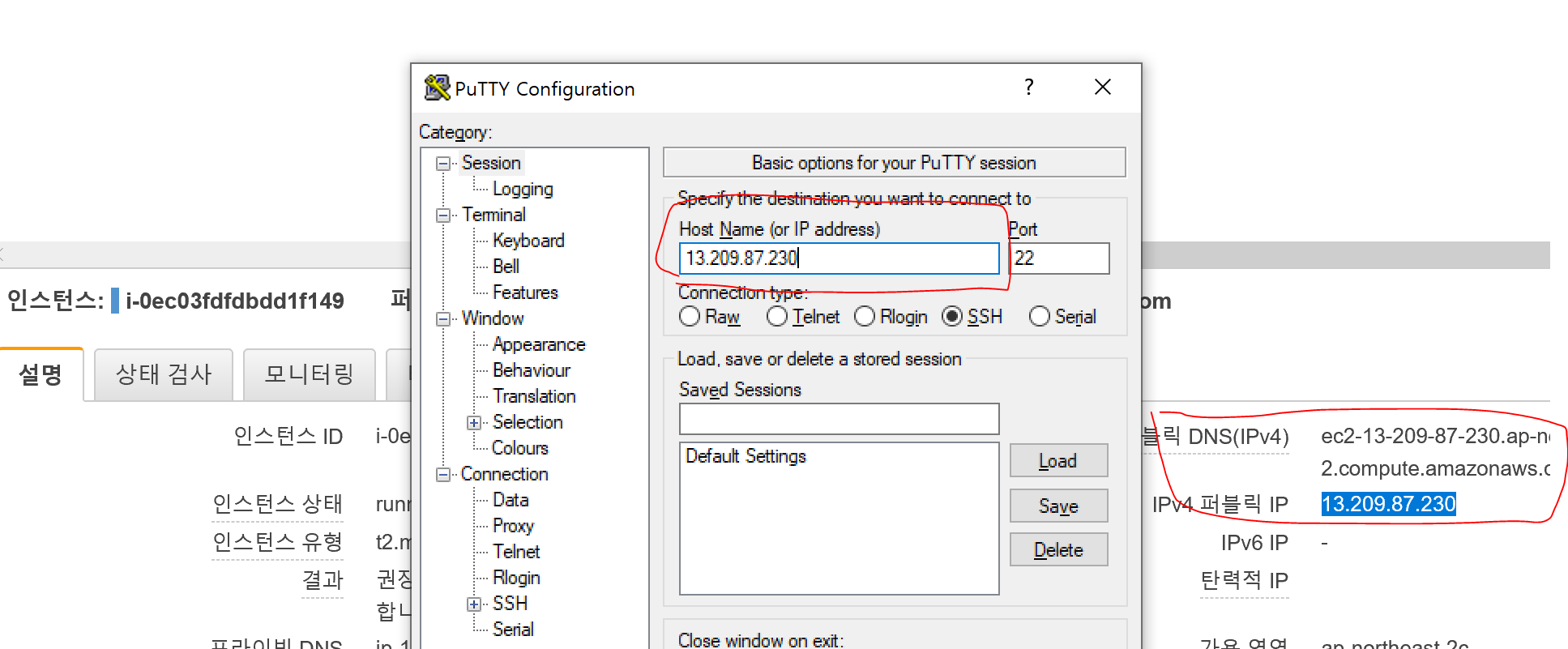 맥에서 작업할 때는 맥 터미널로 접속하는데, 윈도우 터미널은 적응이 잘 안되더라고요. 그래서 putty를 사용해서 접속합니다. ip주소랑 aws에서 다운받은 key를 세팅하면 바로 접속이 됩니다.