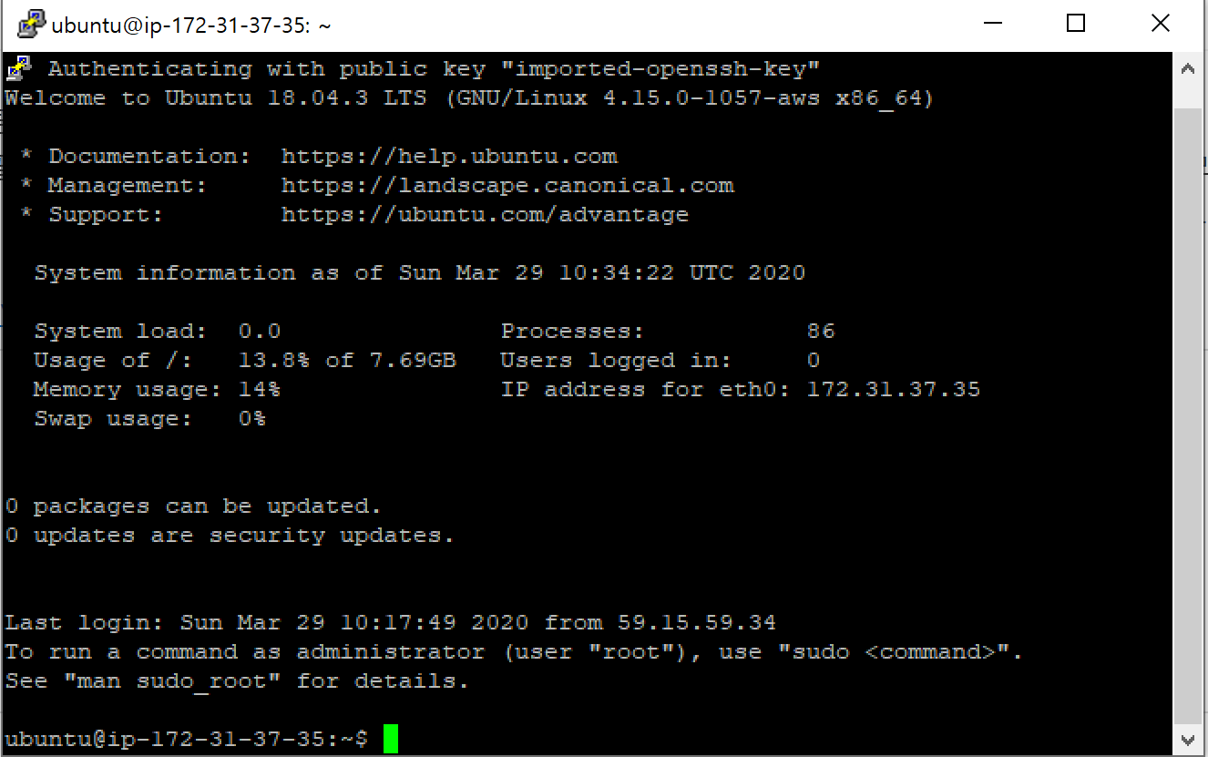 putty에서 ip주소와 키를 세팅하고, open을 누르면 명령 프롬프트 창이 하나 실행됩니다. 여기서 어떤 계정으로 로그인할지를 묻는데, ubuntu는 기본 루트 계정이 ubuntu이기 때문에 Login as를 ubuntu로 입력합니다.
