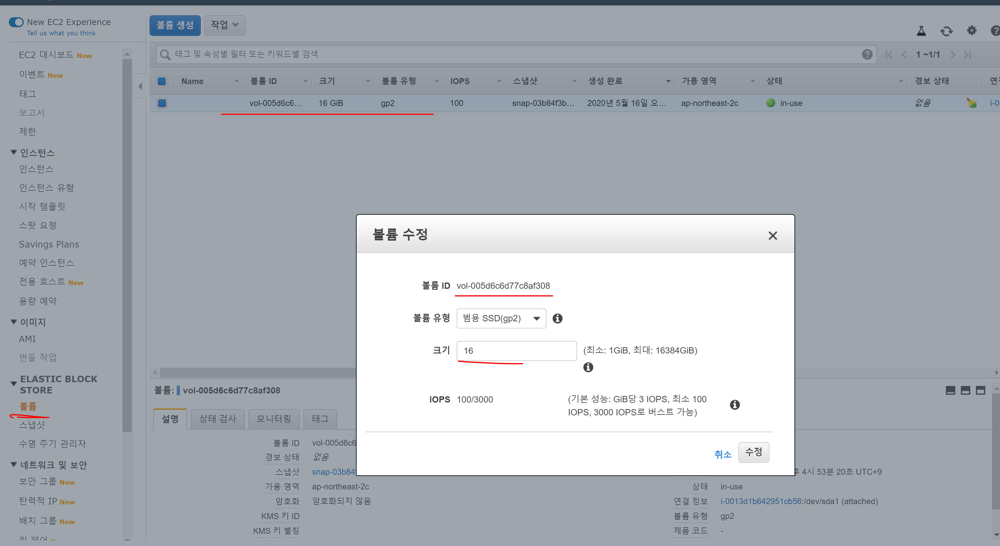 당장 AWS console에 로그인해서 용량을 늘려보자
