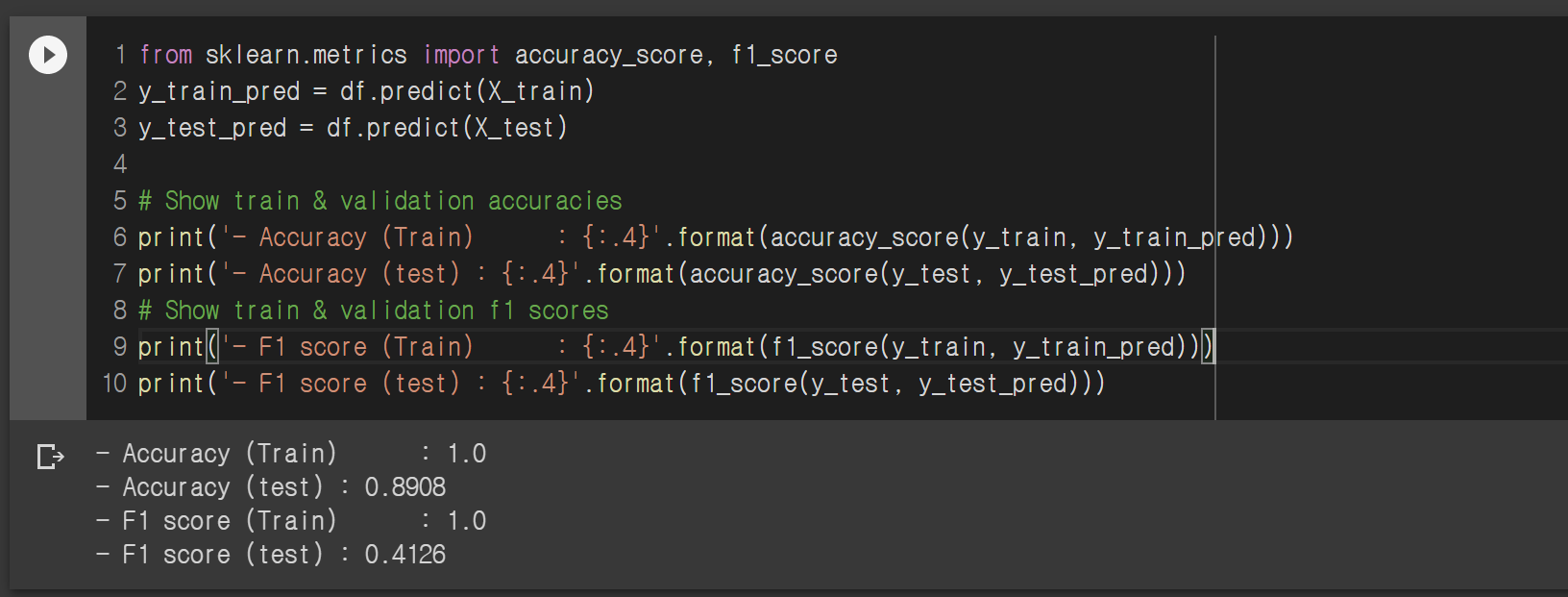 성능 평가는 정확도(Accuracy)와 F1 Score로 진행했습니다. Train이 1.0으로 나오는 건 100% 정확도인데, 학습 데이터로 학습한 모델이 학습 데이터를 다시 예측하면 당연히 정답을 예측하겠죠? 반면 학습하지 않았던 테스트 데이터는 정확도가 0.89로 89%의 정확도를 보여줍니다.
