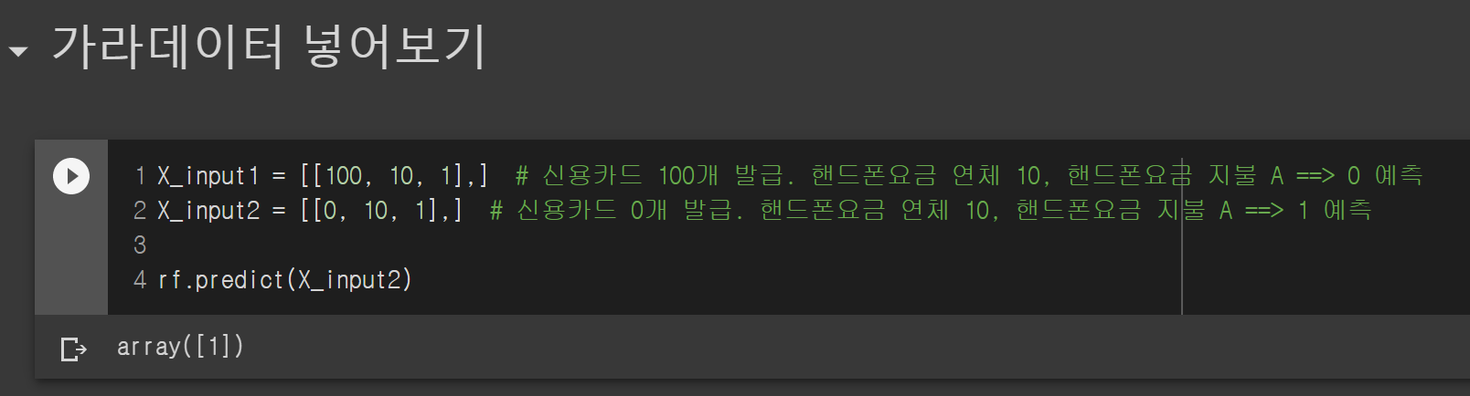 X_input1을 넣었을 때는 대출 연체가 0이었는데 X_input2를 넣으니 대출연체가 1이 나오네요 ㅋㅋ 이런 식으로 서비스를 만들 수 있습니다.