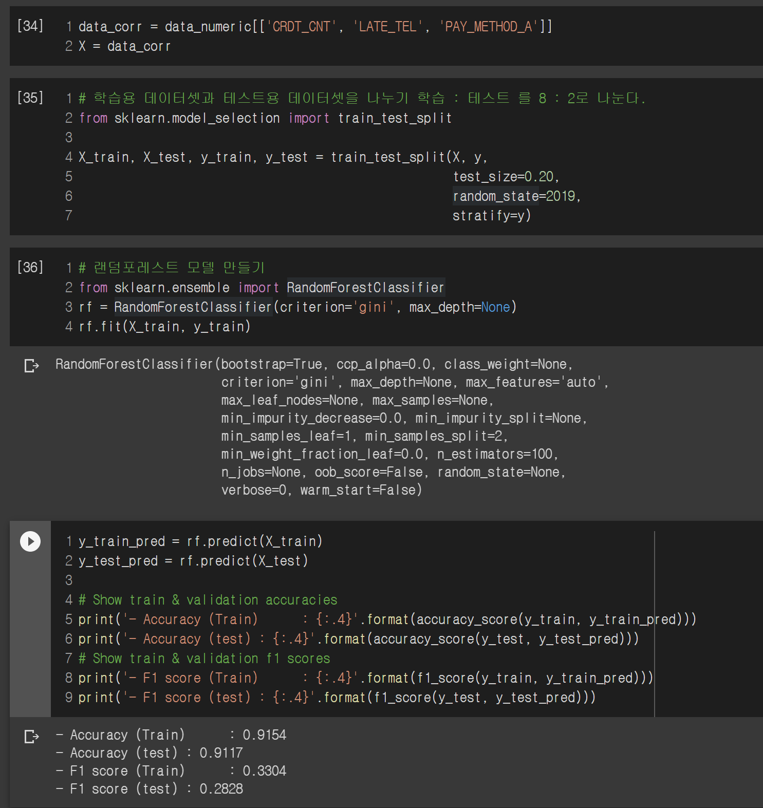랜덤 포레스트가 의사결정나무보다 정확도가 3%정도 더 높네요. 아마 대부분의 트리 모델중에 랜덤포레스트가 제일 높을 겁니다. 검색해 보면 여러 트리 모델이 있는데 한 번씩 써보세요! (어차피 모델만 바꿔주면 되기 때문에 금방 합니다)