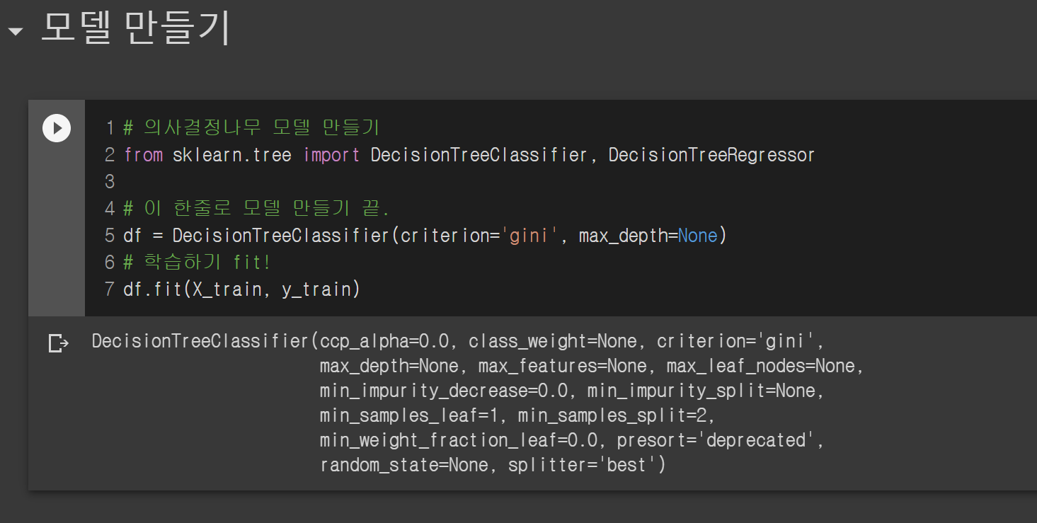 df라는 모델을 DecisionTreeClassifier로 만들고 df.fit 하면 학습까지 완료됩니다.