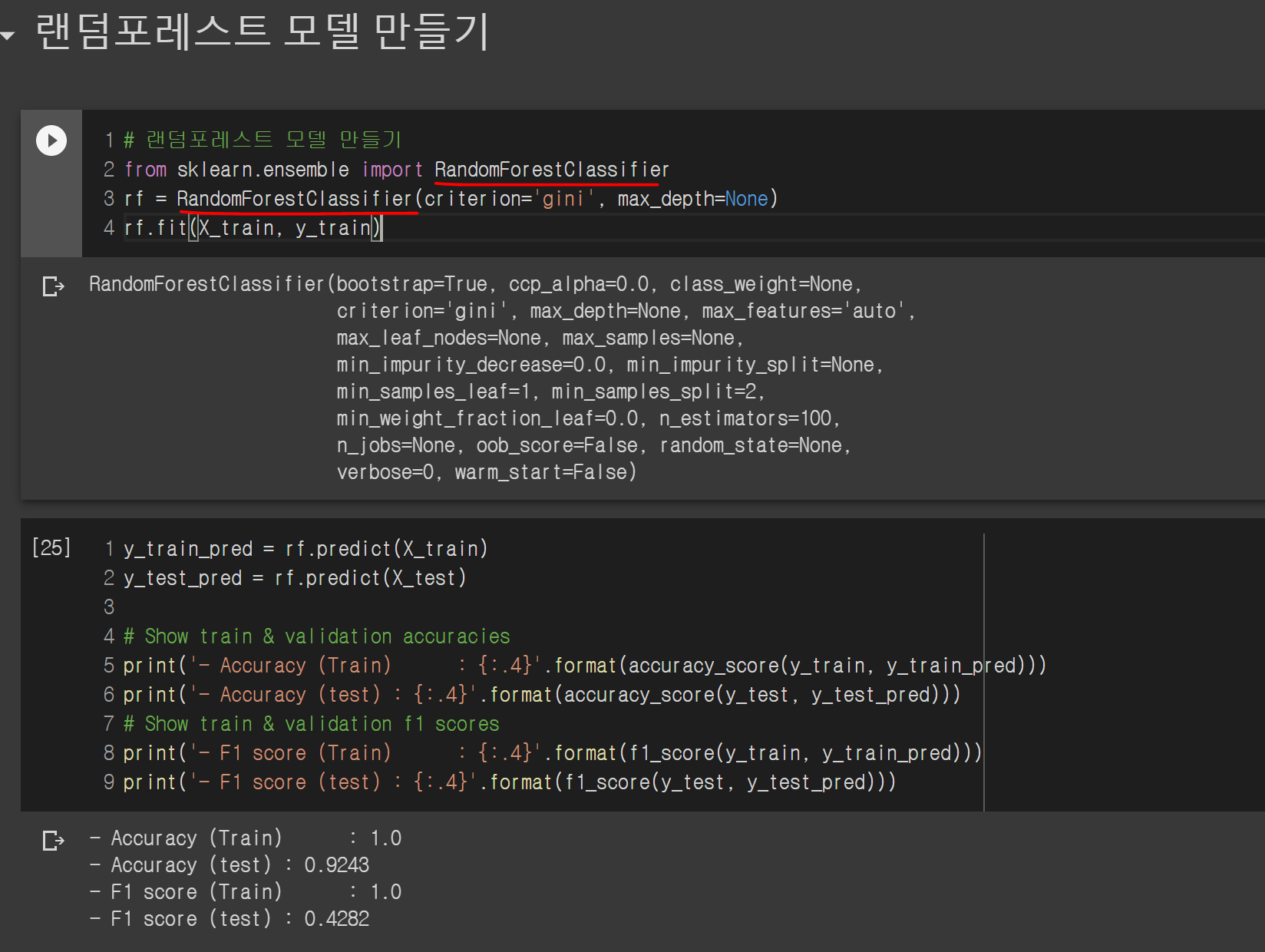 의사결정 나무 상위 호환인 랜덤 포레스트를 만들어보겠습니다. 사실 위 과정에서 하나만 바꿔주면 됩니다.