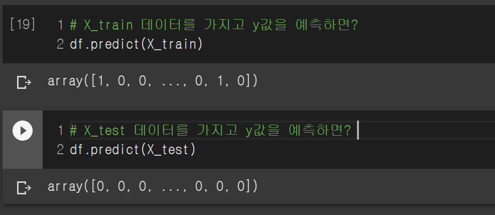 모델.predict를 하게 되면 입력된 값을 이용해 y값을 예측하게 됩니다. 여기서는 해당하는 사람의 신용카드 발급수나 핸드폰 연체료 등(X)을 이용해 그 사람이 연체를 할지 말지(y)를 예측하겠죠. 그래서 함수를 사용해서 출력해보면 0과 1 값으로 가득 찬 배열이 나옵니다. 이 배열이 의미하는 건 X에 들어있는 많은 사람들 각각이 연체를 할지 안 할지 예측한 값입니다.