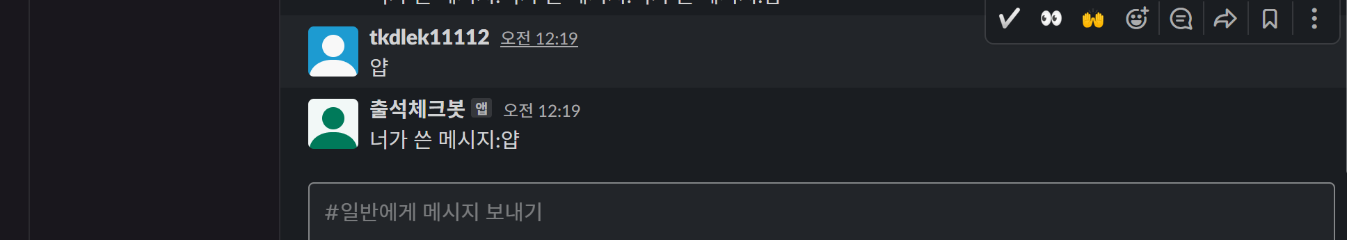 이제 슬랙에서 ㅊㅊ를 입력해 봅시다.