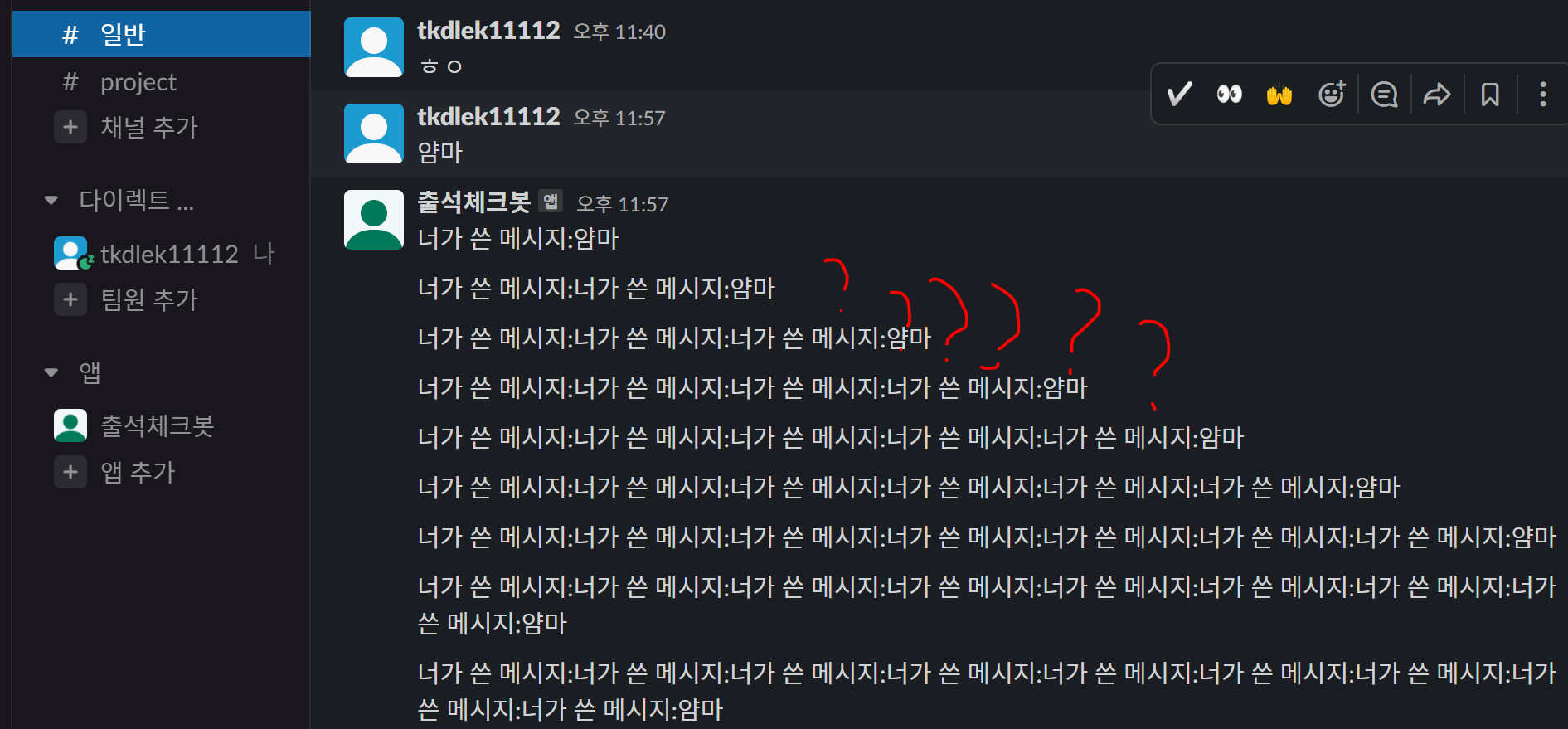 중간에 if문으로 user가 봇이 아닐 경우에만 post_message로 메시지를 보내주게 만들었습니다. 다시 한번 슬랙에 메시지를 날려볼까요?