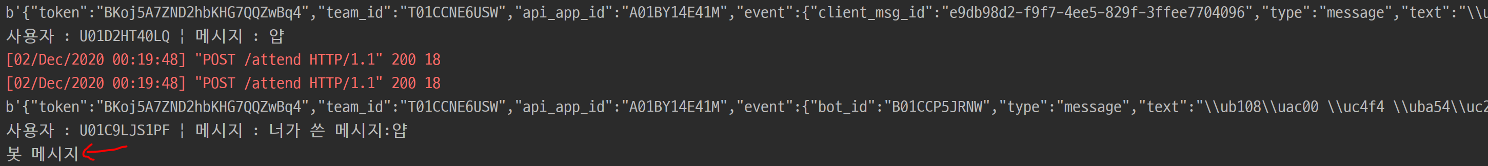 사용자가 입력한 메시지는 client_msg_id를 달고 옵니다. 근데 봇이 혼자 입력한 메시지는 bot_id를 달고 오네요. 그럼 event에 bot_id가 있고 없고로 봇인지 사람인지를 구분할 수 있겠죠!!?!?!?