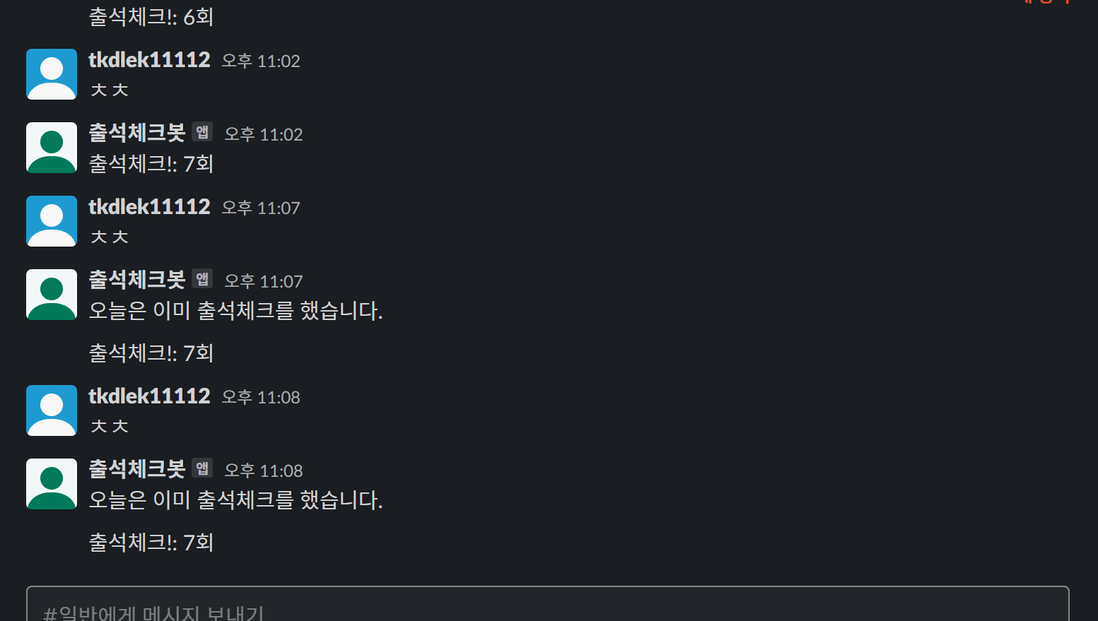 slack.chat.post_message('#일반', f'오늘은 이미 출석체크를 했습니다.', as_user=None)