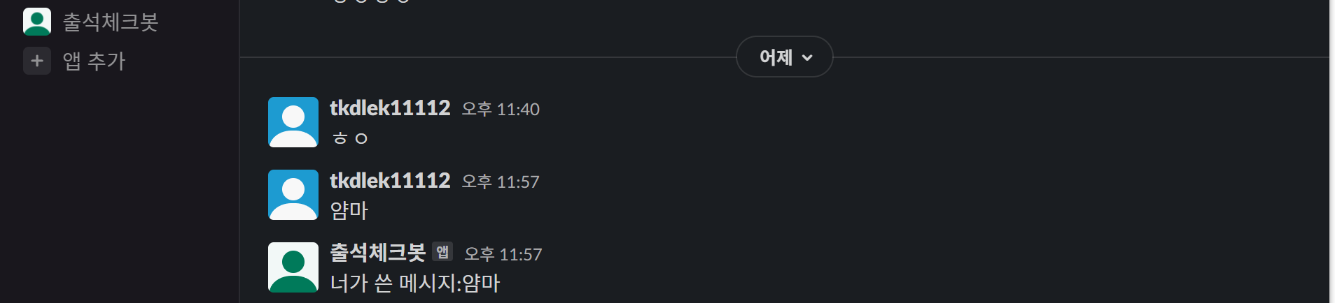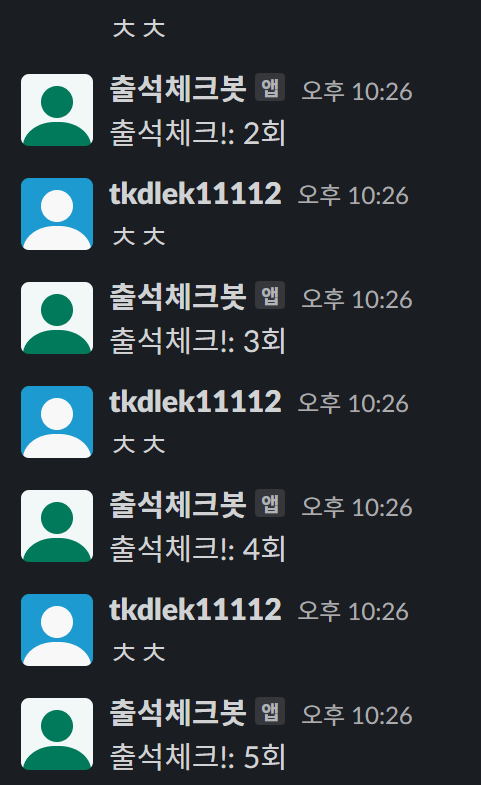 사용자의 메시지를 그대로 슬랙으로 보내주던 곳에 메시지가 'ㅊㅊ'이면 출석 횟수를 +1해 주는 코드를 추가했습니다.