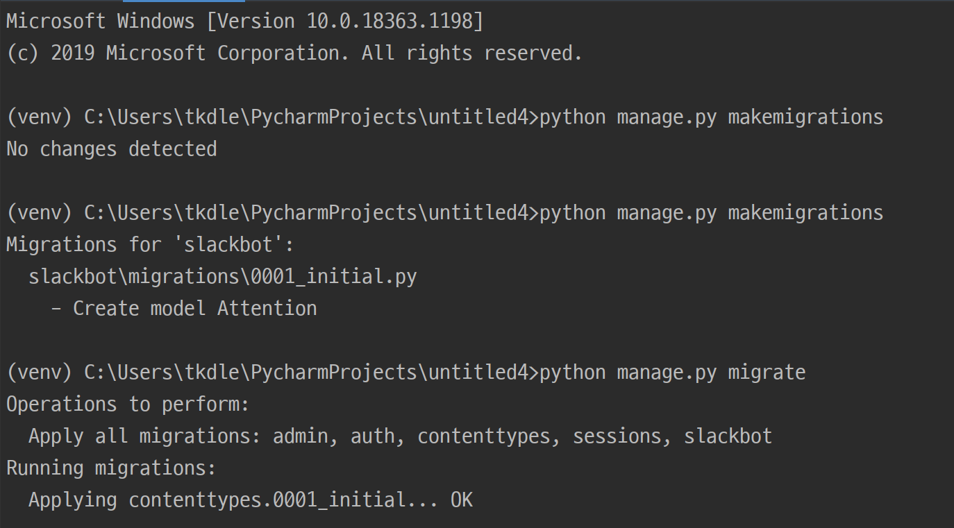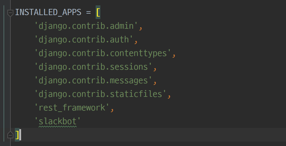 만약 모델을 추가했는데도 makemigrations시 변경된 점을 찾을 수 없다고 나온다면, settings.py에 있는 INSTALLED_APP에 우리가 새로 만든 app인 slackbot을 추가해주었는지 확인합니다.