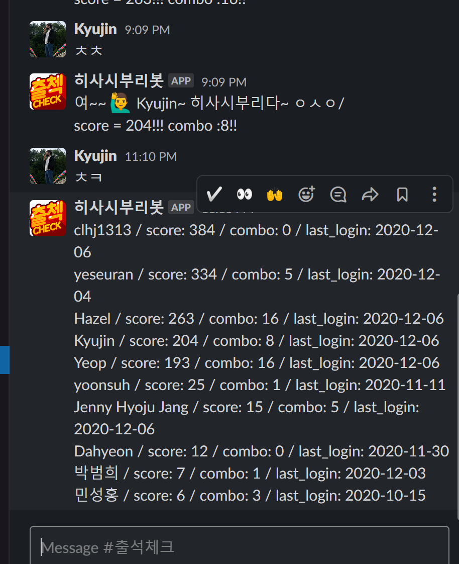 저는 연속적으로 출석체크를 할 경우 combo시스템을 넣어서 점수를 더 높게 주도록 구현했고, ㅊㅊ말고도 ㅊㅋ(체크)를 입력할 경우 전체 사용자의 점수를 출력하게 만들었습니다.