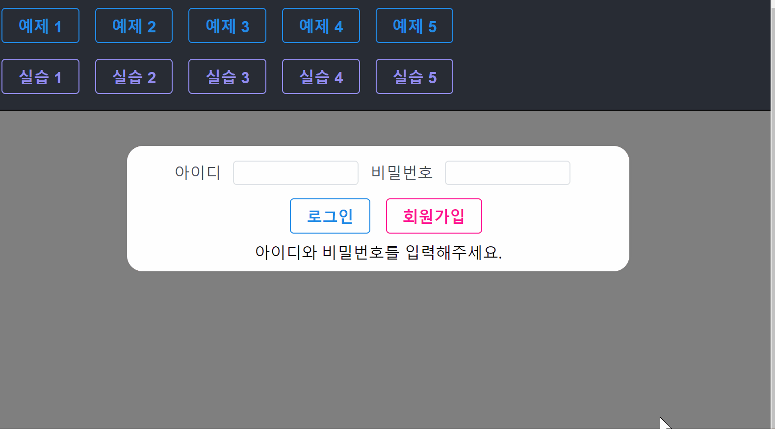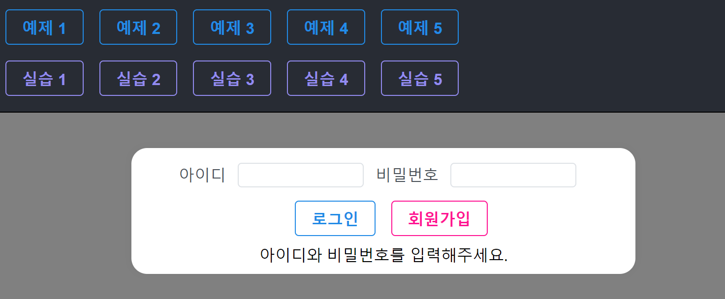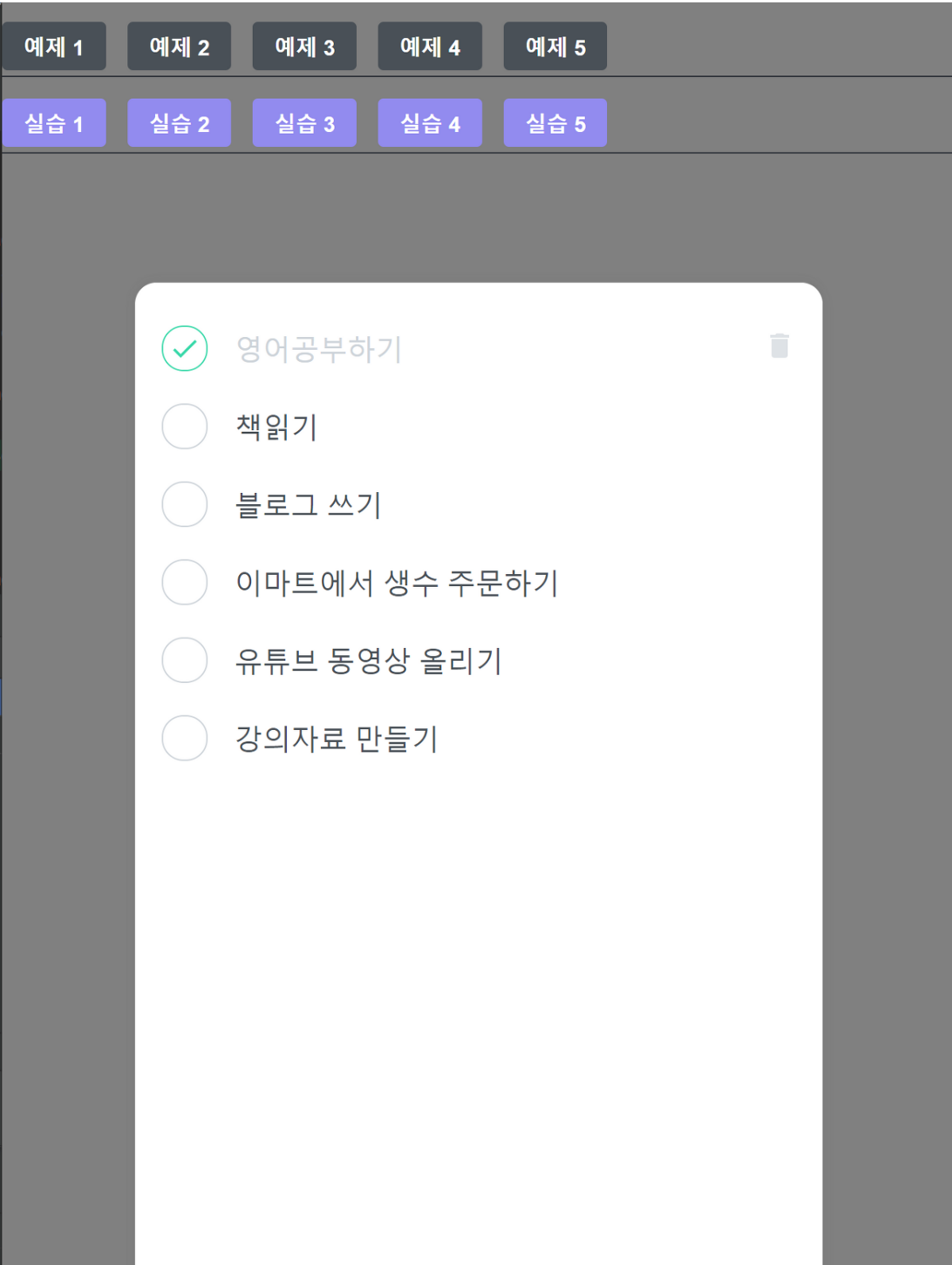 상단에 '예제'와 '실습'버튼이 있는데요, 예제를 누르면 화면이 어떻게 동작하는지 볼 수 있고, 실습은 실제 여러분이 만든 장고 서버로 api를 날려서 데이터를 가져와서 테스트해볼 수 있는 구조로 되어있습니다.