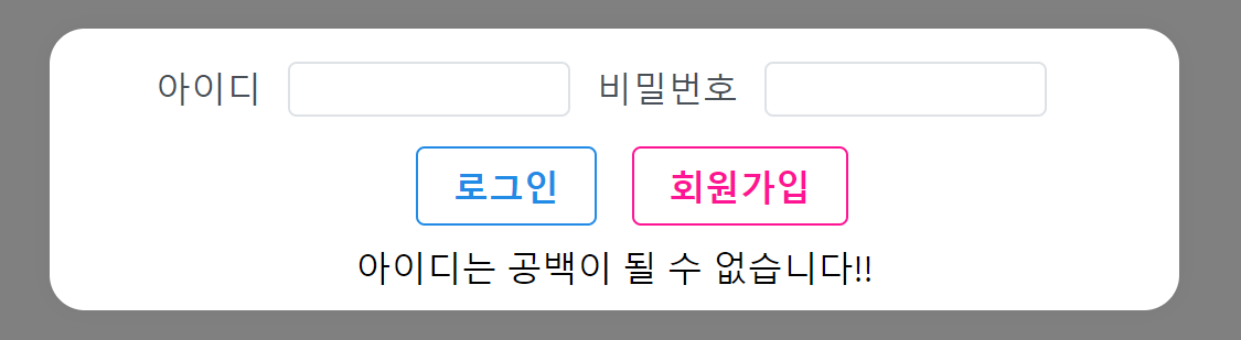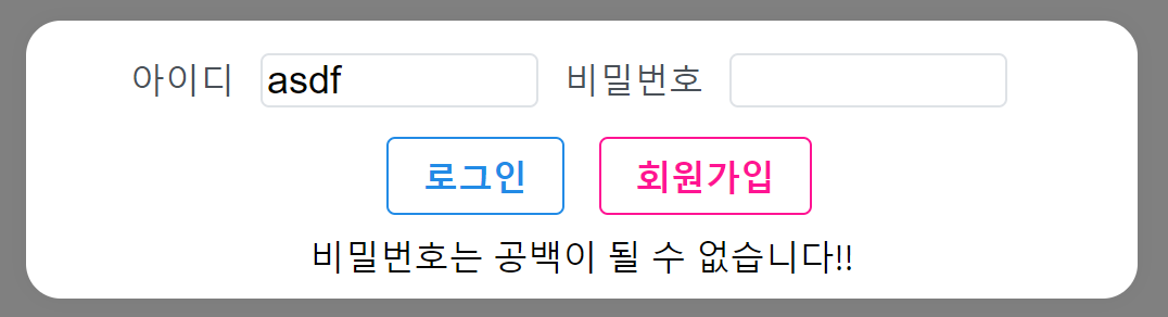 자 다시 본론으로 돌아가서, 회원가입을 만들었지만 몇 가지 예외처리를 해주어야 합니다. 만약 아이디와 패스워드를 입력하지 않고 회원가입을 누르면 어떻게 될까요?
