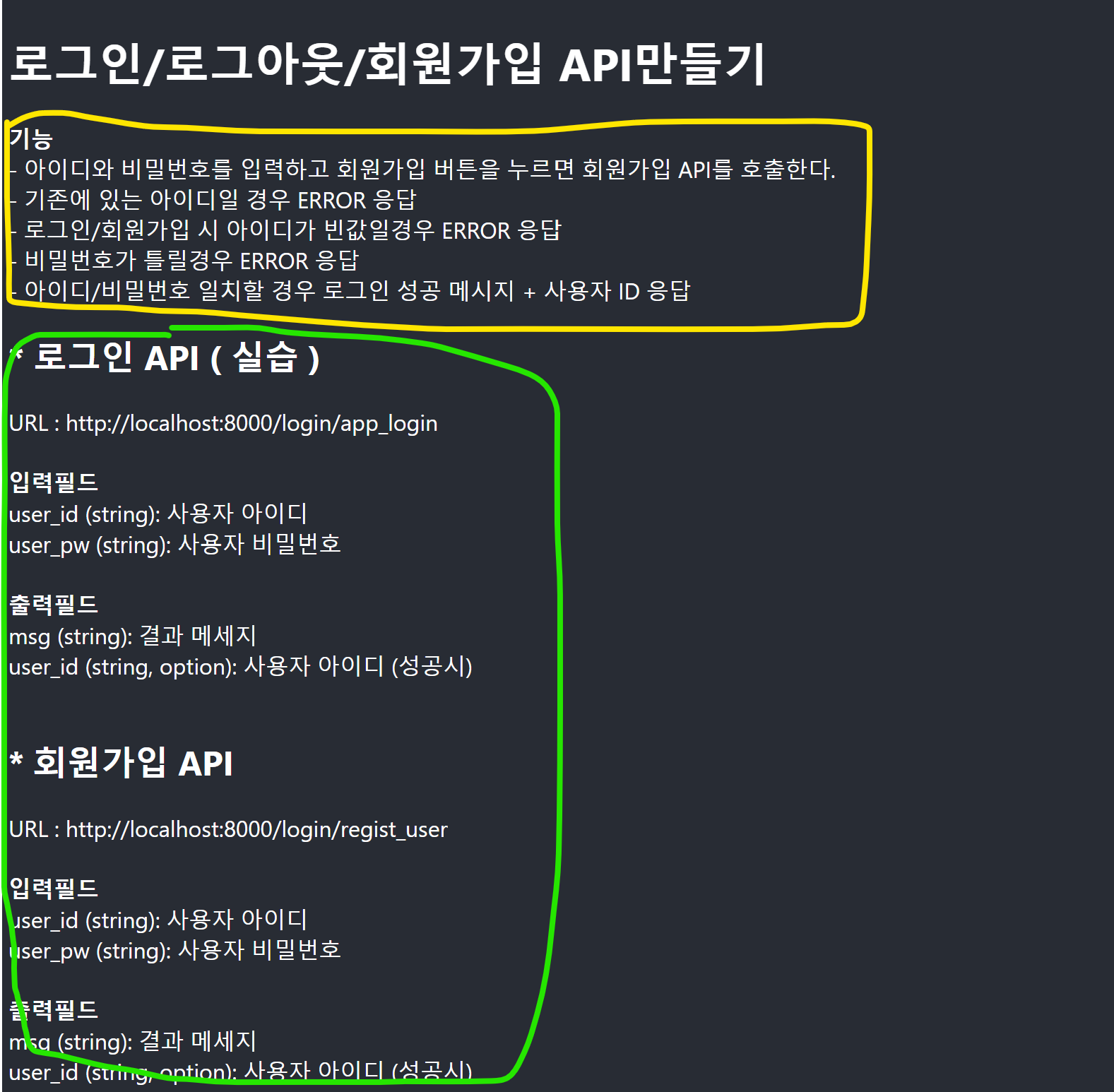 노란색 박스가 화면에서 구현되어야 하는 기능들, 녹색은 API목록입니다. 실습 버튼을 누르면 아마 기능이 동작을 하지 않을 텐데 이 녹색 박스 안에 있는 API들을 장고로 만들어 주시면 동작하게 됩니다.