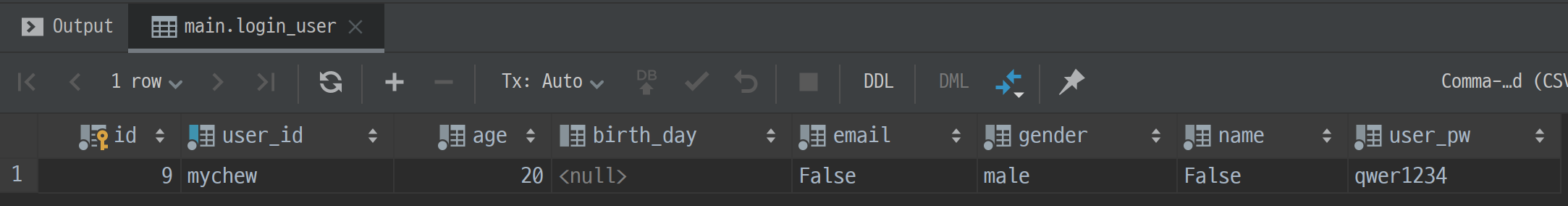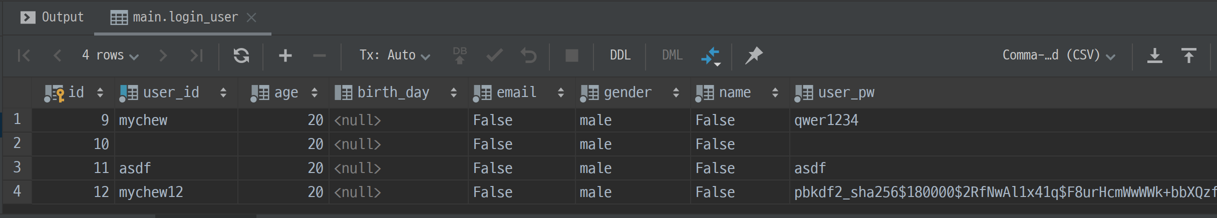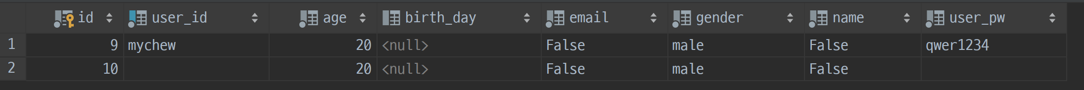 user_id와 user_pw만 들어오니 아래 birth_day나 gender는 공백으로 처리해도 상관없을 것 같네요. 일단 들어온 값으로만 모델에 채워서 만들어보겠습니다.