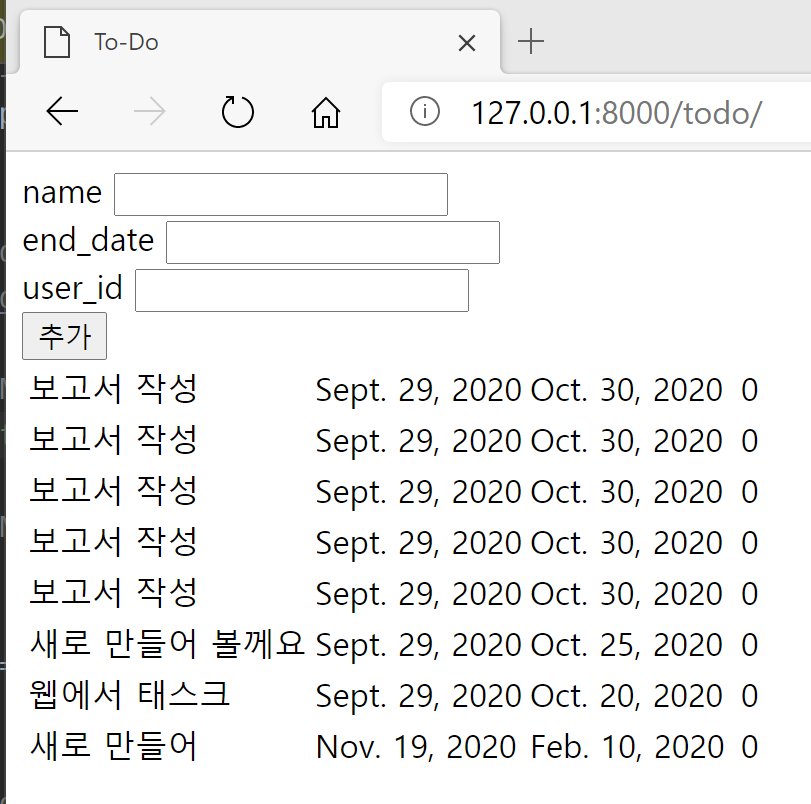 지난 강의인 서버 개발자가 되는 법 4편에서 장고(Django)를 이용해서 투두앱(To-Do list)을 만들기 시작했습니다. 잠깐 지난 시간에 만들어진 화면을 볼까요?