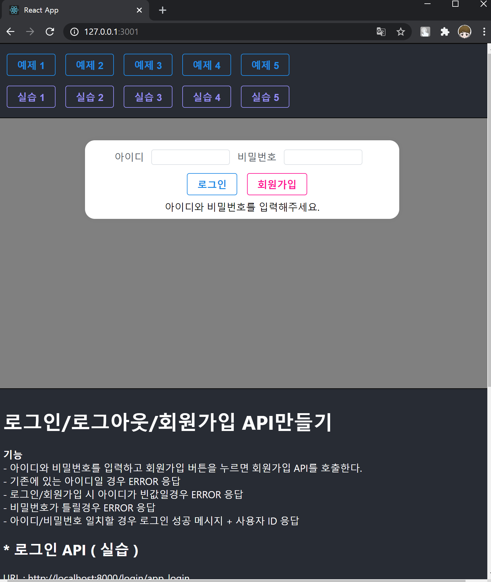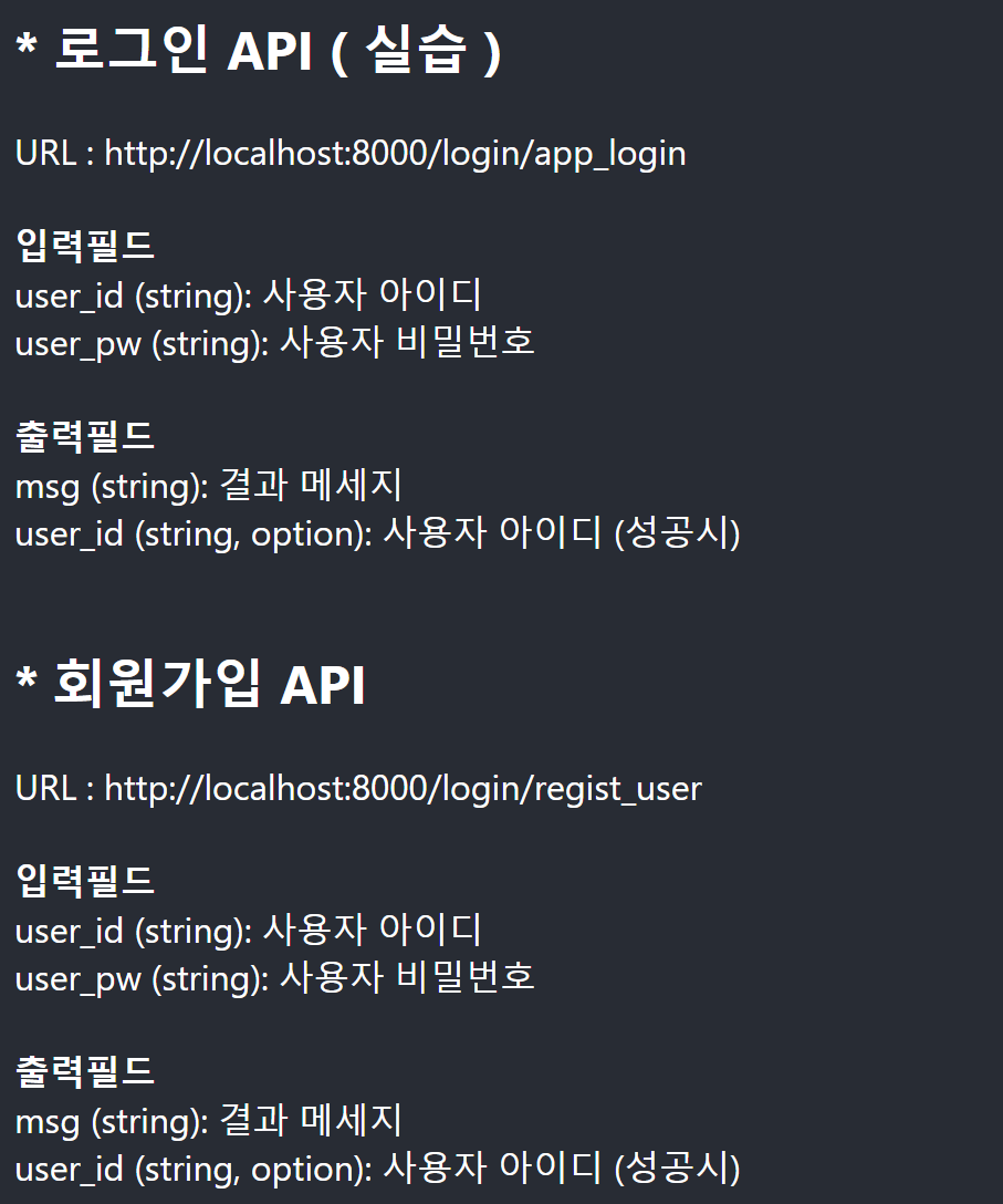 그럼 실습 1을 눌러보세요. 실습 1 화면에서는 로그인과 회원가입을 눌러도 반응을 안 합니다. 네 여기서부터는 Django 서버가 필요한데요, 일단 아래 API 명세를 한번 읽어봅니다.