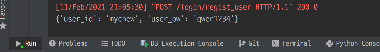 이제 ~/login/regist_user를 호출하면 RegistUser가 실행되면서 request의 data영역을 콘솔에 찍을 겁니다.