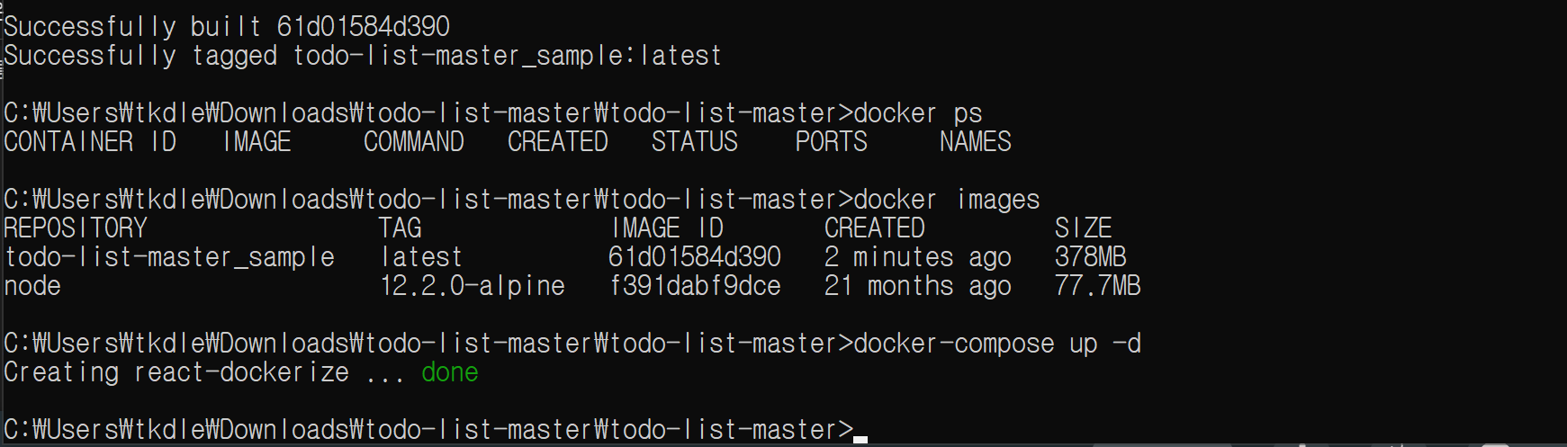 설치가 정상적으로 되면 up 명령어를 통해 도커를 실행시키면 됩니다.