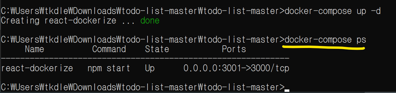 docker-compose ps를 눌렀을 때 Ports가 0.0.0.0:3001 -> 3000/tcp로 되어있는 것을 확인할 수 있습니다. 제가 도커 안에 리액트를 3000번 포트로 띄워노았고, 도커 밖에서 3001 포트로 접속하면 도커 안에 3000번 포트로 이어지게 됩니다.