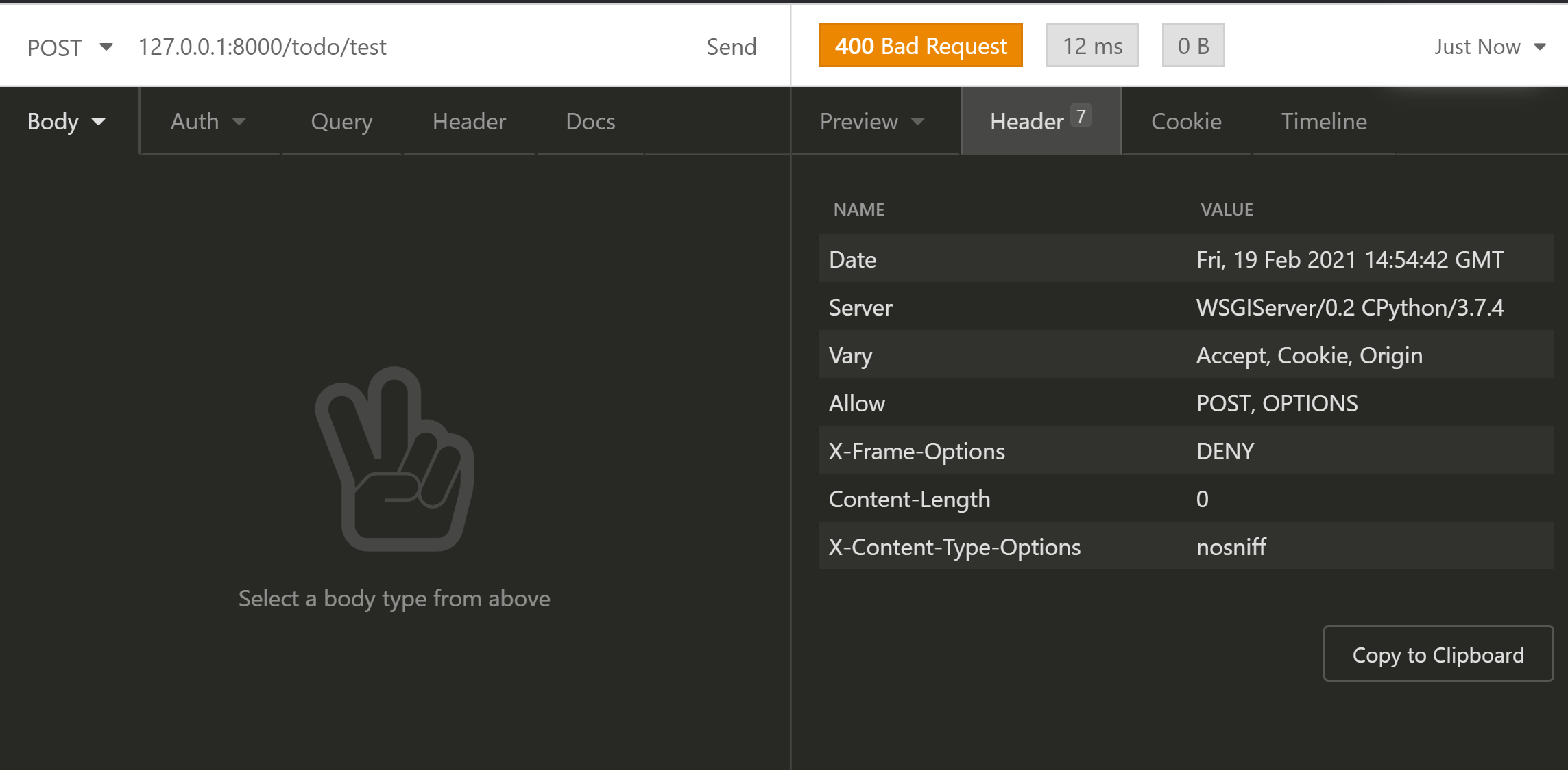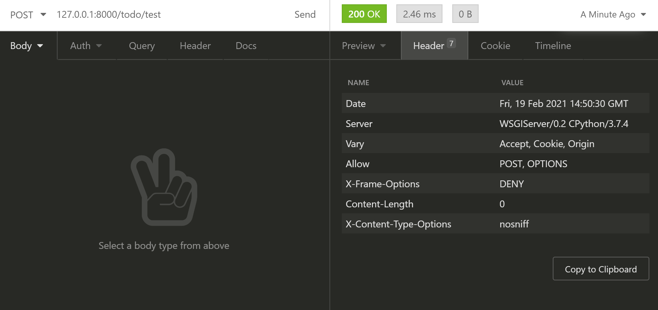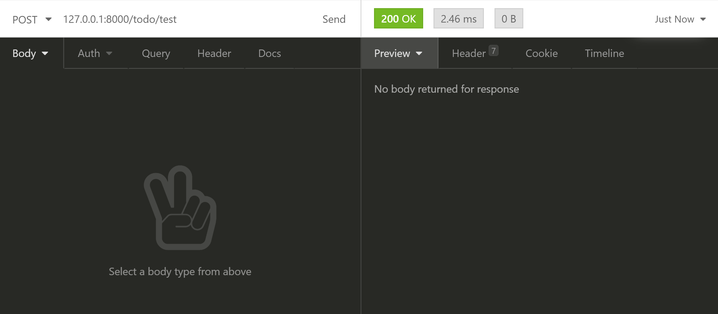 preview에 No body라고 나오지만 옆에 Header를 보면 7이라고 적혀있습니다. Header를 눌러봅시다.