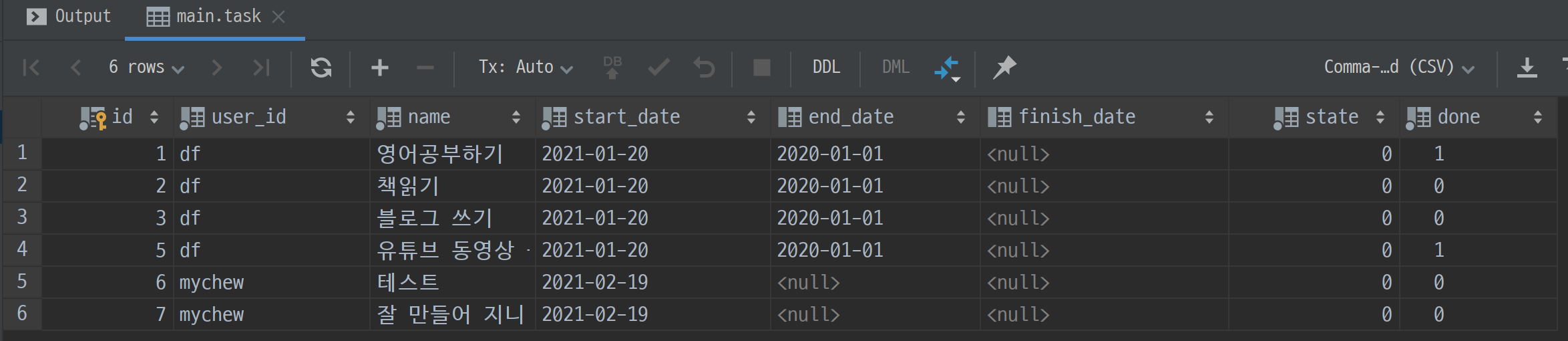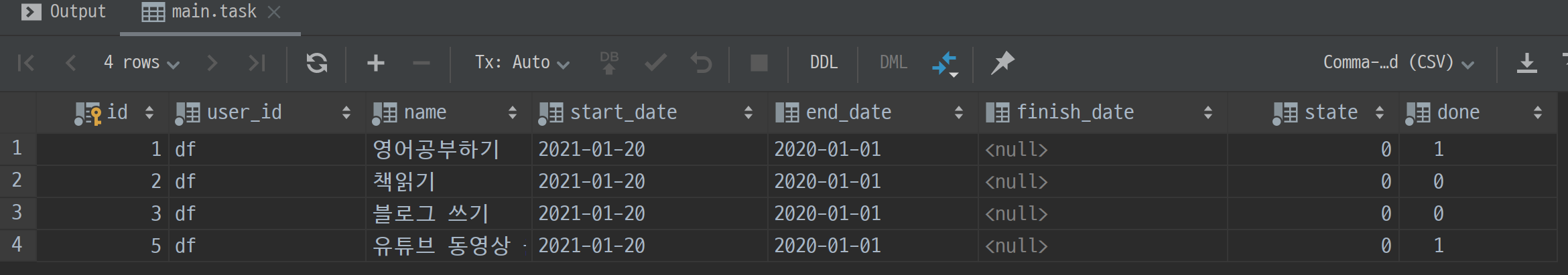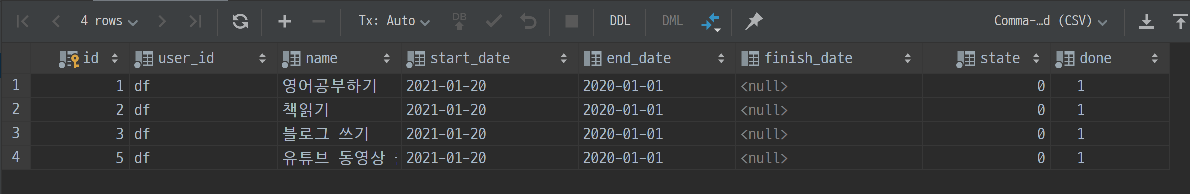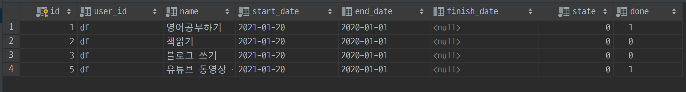 파이참 database메뉴에서 테이블에 컬럼을 추가할 수 있습니다. + 버튼을 눌러서도 되고, insert 쿼리를 사용하셔도 됩니다. 어차피 user_id는 보지 않기 때문에 아무 값이나 넣어주시면 됩니다. 실제로 필요한 건 id, name, done 세 가지입니다. 여기서 id는 빈 값으로 생성해도 자동으로 생성되기 때문에 넣지 않으시는 게 좋습니다.