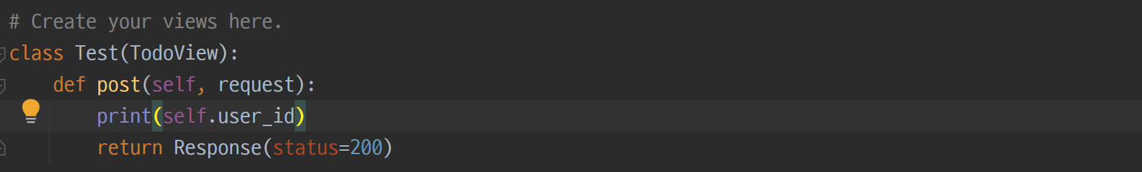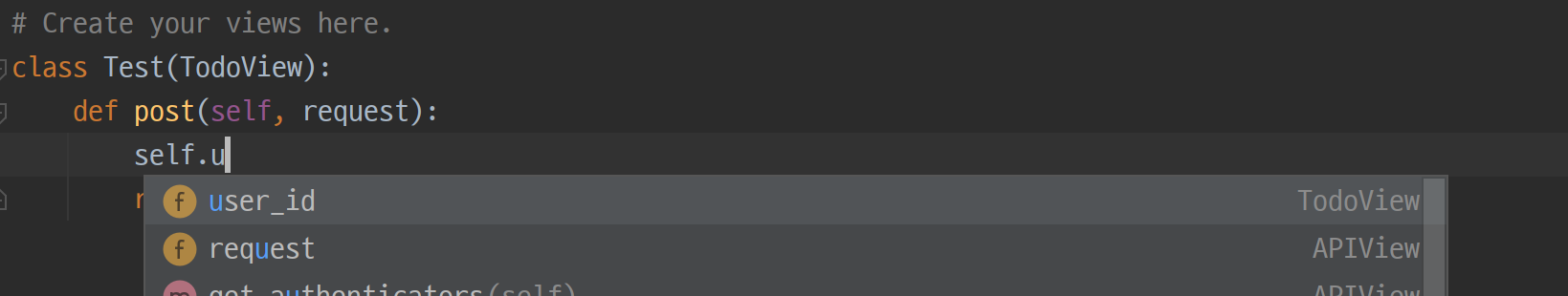 아무 에러가 안나죠? 이제 Test라는 class는 TodoView를 상속받았기 때문에 아까 TodoView class에서 선언한 user_id를 쓸 수 있습니다.