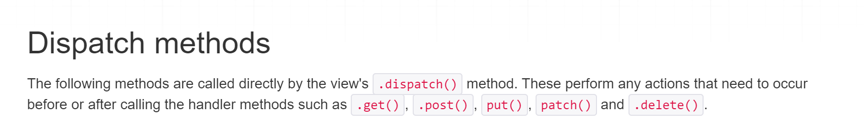dispatch 함수가 추가되었습니다. drf에서 dispatch는 특정 요청이 들어왔을 때 어떤 요청인지 분기 태워주는 역할을 합니다. 이렇게 모르는 내장 함수가 튀어나왔으면 공식문서를 찾아봐주는 연습을 하면 도움이 많이 됩니다.