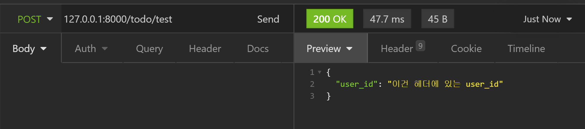 자 이렇게 헤더에 id값을 넣었더니 user_id값이 헤더의 값과 같게 나오게 되었습니다. 이제 user_id를 헤더로 올렸으니 기존에 만들었던 api에서 user_id를 지워도 됩니다!!