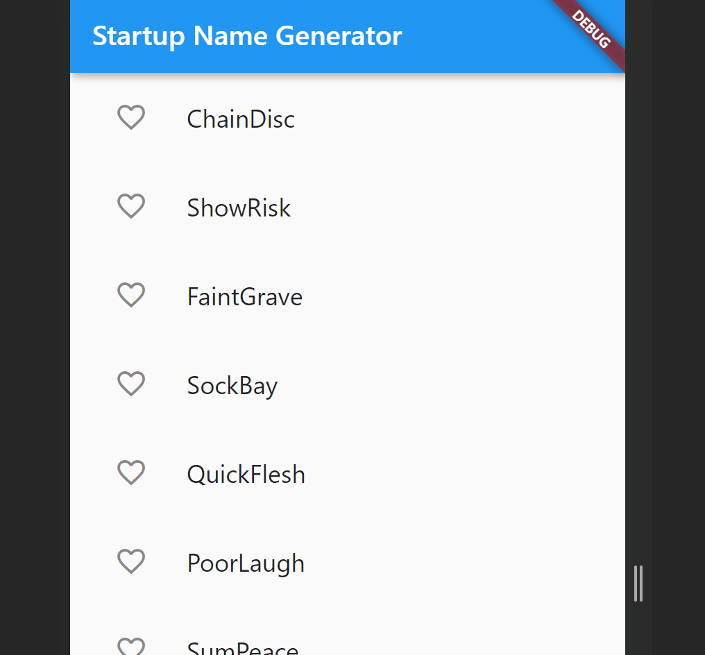 실제로 앱을 실행하면 가장 먼저 실행되는 건 void main()이다. 화살표 연산자(=>)로 runApp을 실행하고 MyApp() class를 실행하도록 되어있다. MyApp 안에는 RandomWords class를 호출하고, RandomWords는 _RandomWordState를 호출해서 결론적으로는 WordPair에 있는 텍스트로 구성되어있는 ListTile ListView를 반환한다.