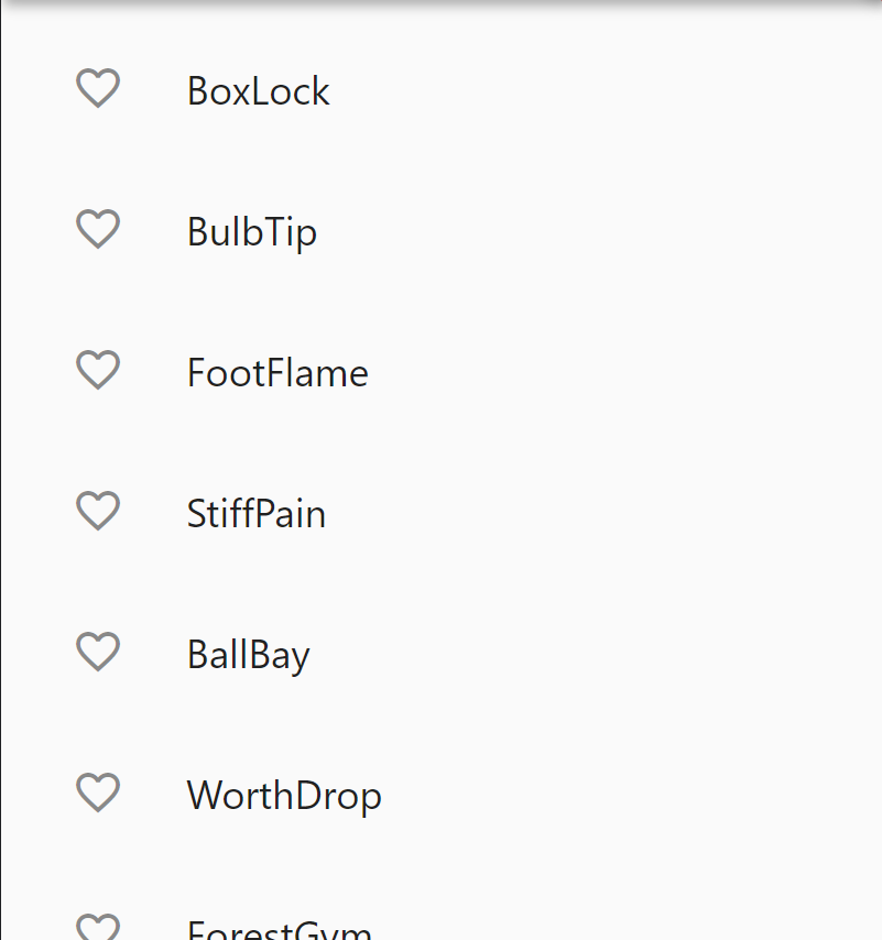 지금 위에 있는 코드를 실행하면 리스트 왼쪽에 하트? 아이콘이 뜹니다. ㅋㅋ 이건 뭔가 증권 앱에서 관심종목? 느낌으로 favorite을 등록할 수 있는 기능을 만들려고 한다.