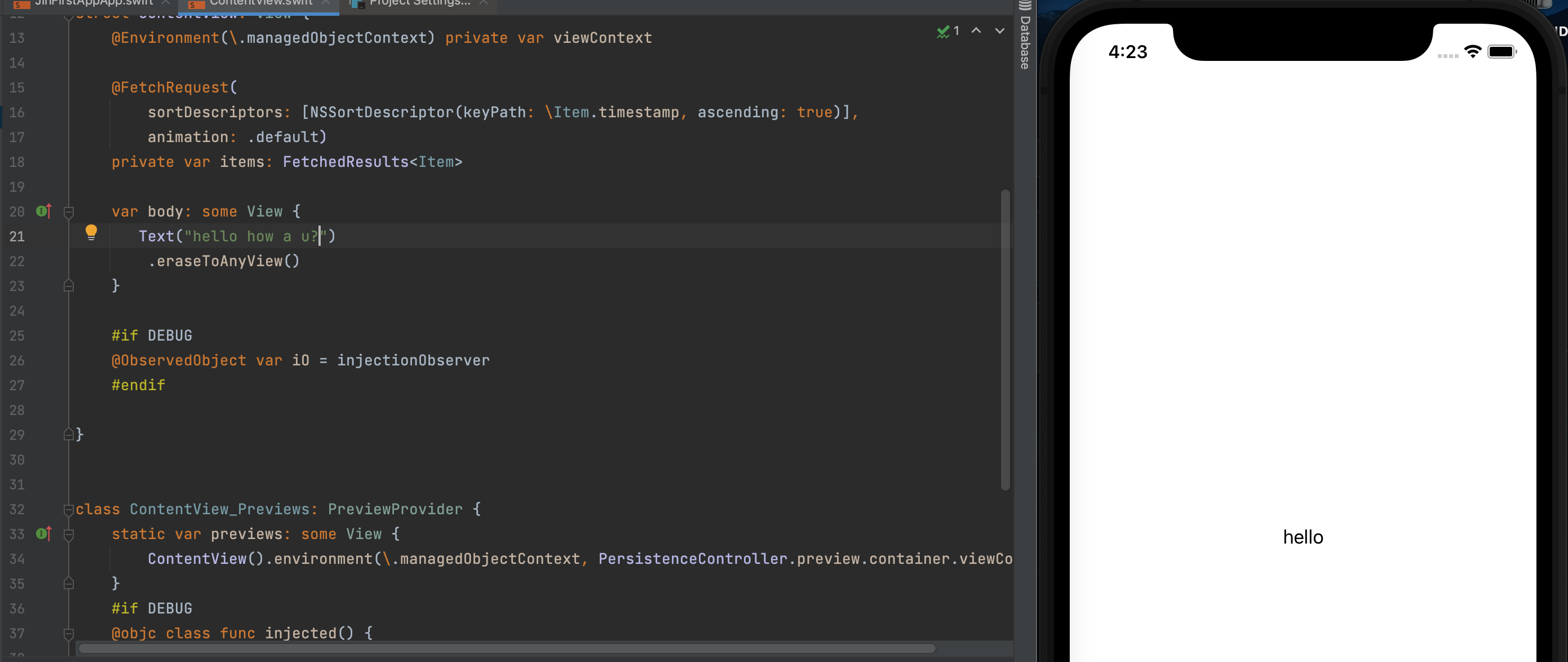 근데 시작부터 말썽인게, xcode의 경우 에디터에 preview화면이 있어서 코드 바뀔 때마다 화면이 어떻게 변하는지 알 수 있는 반면, appcode에는 preview가 없다.
