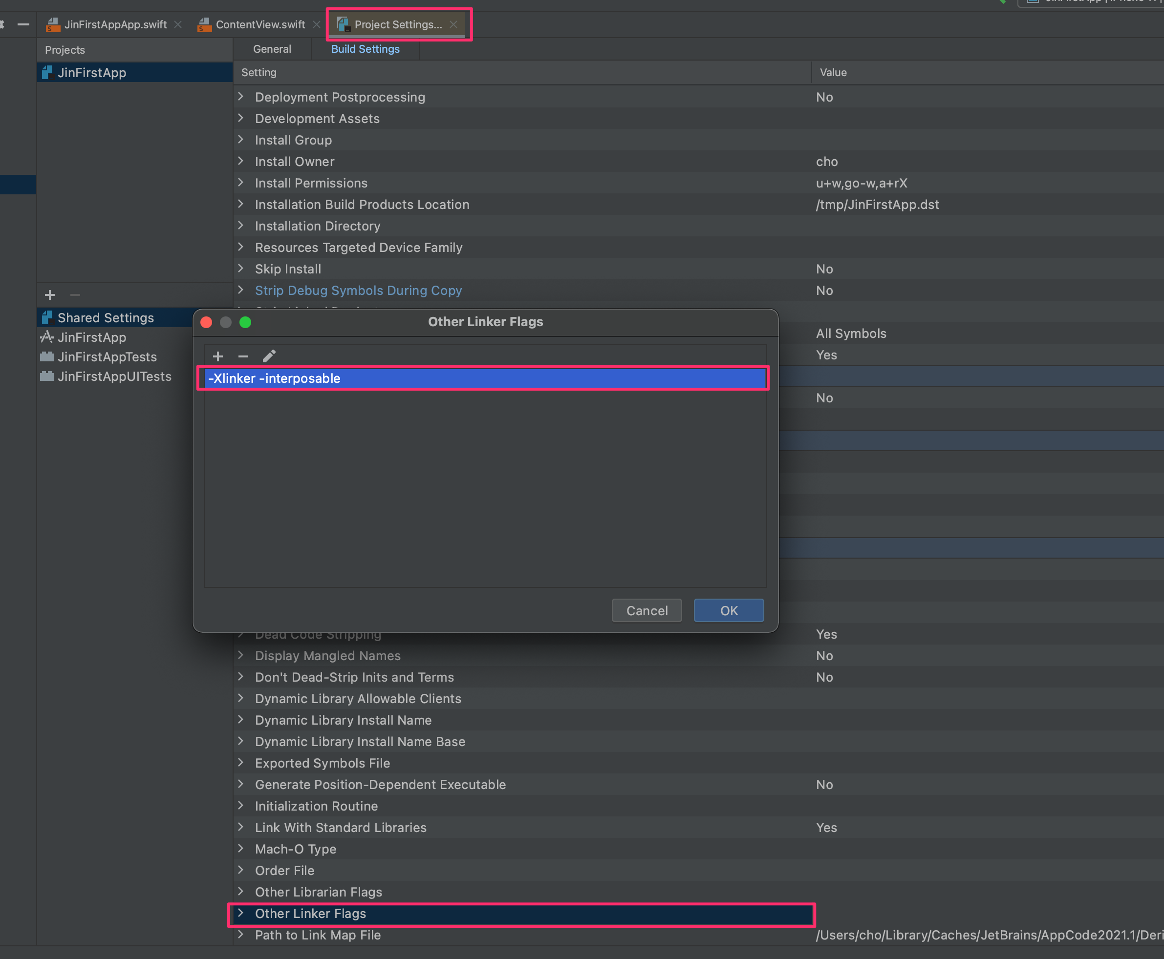 이것만 하면 되는 건 아니고 프로젝트에 몇 가지 설정을 더해줘야 되는데, 일단 커맨드 + ; 을 눌러서 프로젝트 설정에 간 다음 Build Settings에 Other Linker Flags 값에 "-Xlinker -interposable"를 추가한다.